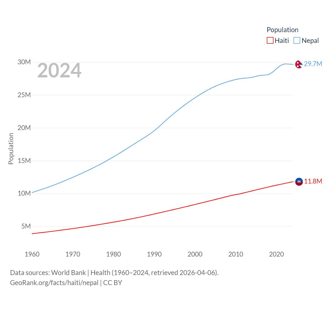 Haiti has a population of 11.8M (ranked 83/197), compared with 29.7M in Nepal (ranked 51/197). Haiti's land area is 10,641 sq mi versus 55,348 sq mi for Nepal (ranked 142nd vs. 92nd).