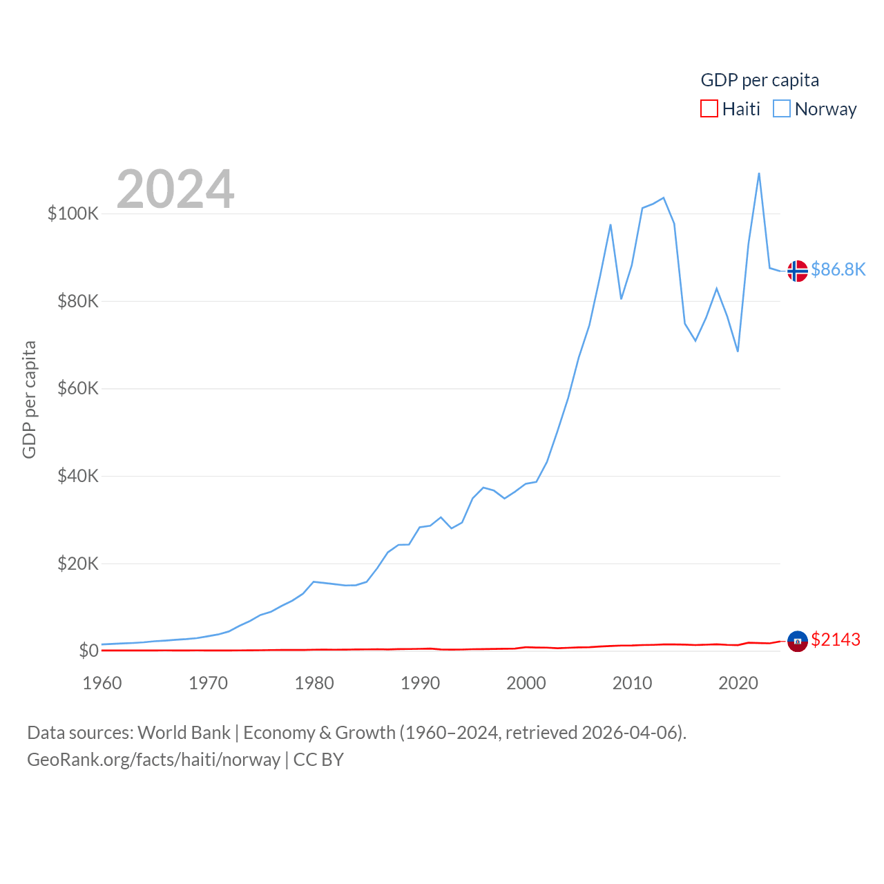 By GDP, Haiti ranks 117/197 ($25.2B) and Norway ranks 32/197 ($484B). By GDP per capita, Haiti ranks 153/197 ($2,143), while Norway ranks 8/197 ($86,785).