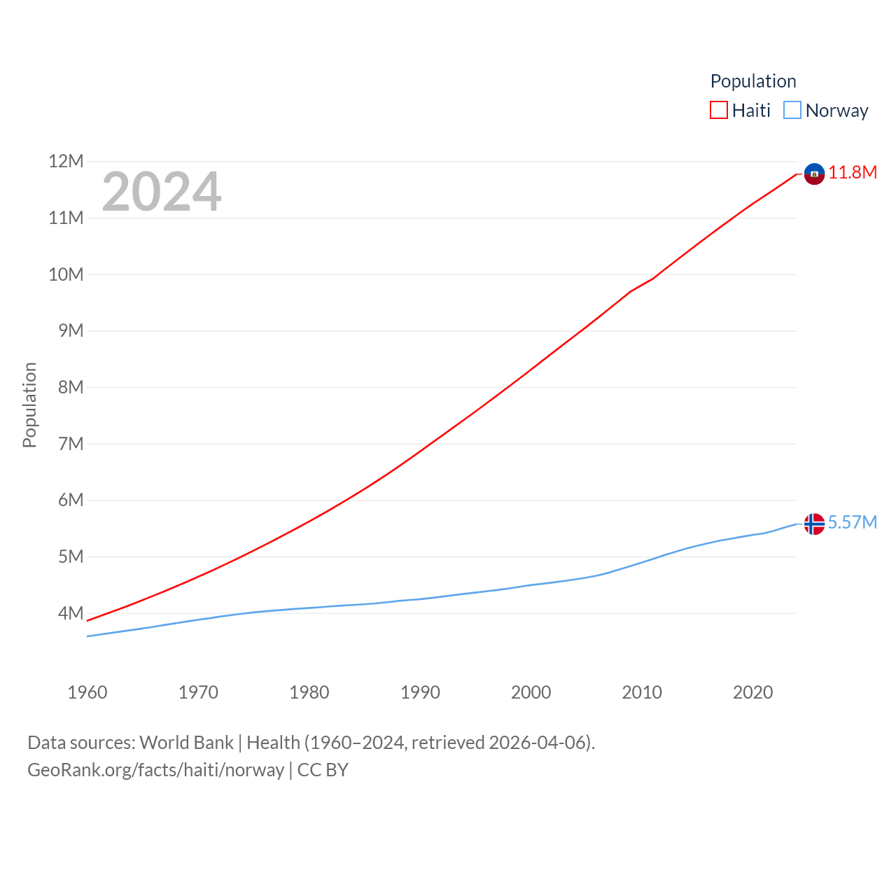 Haiti has a population of 11.8M (ranked 83/197), compared with 5.57M in Norway (ranked 118/197). Haiti's land area is 10,641 sq mi versus 140,645 sq mi for Norway (ranked 142nd vs. 62nd).