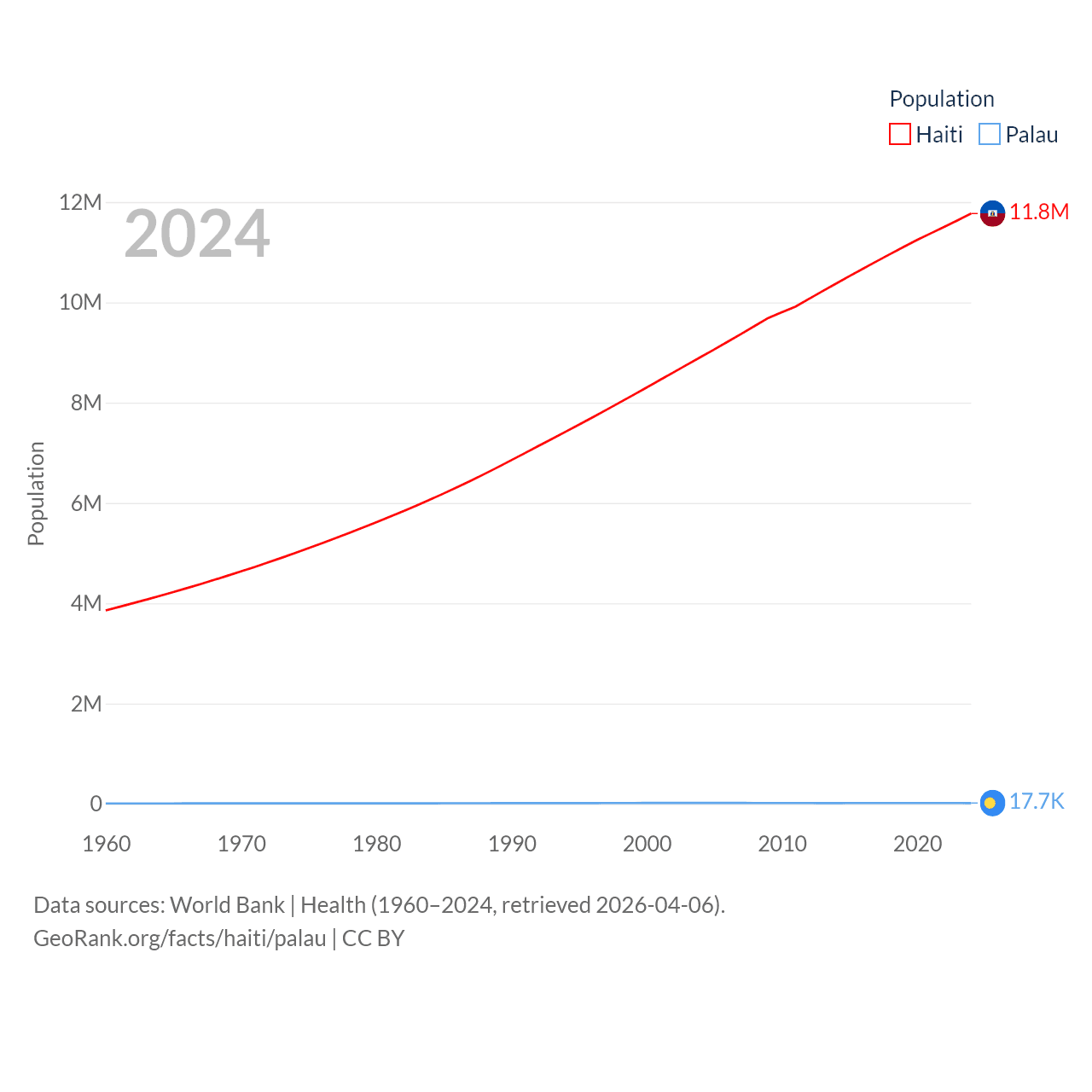 Haiti has a population of 11.8M (ranked 83/197), compared with 17.7K in Palau (ranked 194/197). Haiti's land area is 10,641 sq mi versus 177.6 sq mi for Palau (ranked 142nd vs. 180th).