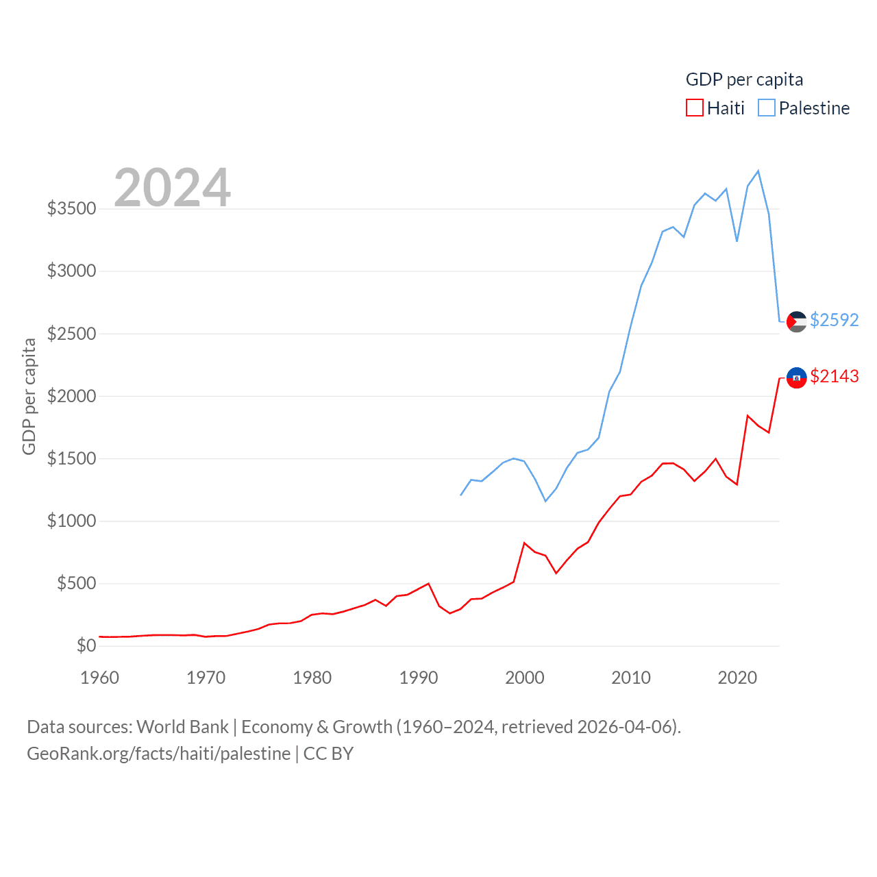 By GDP, Haiti ranks 117/197 ($25.2B) and Palestine ranks 146/197 ($13.7B). By GDP per capita, Haiti ranks 153/197 ($2,143), while Palestine ranks 147/197 ($2,592).