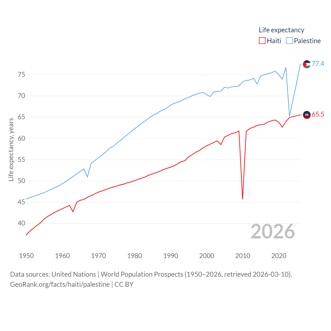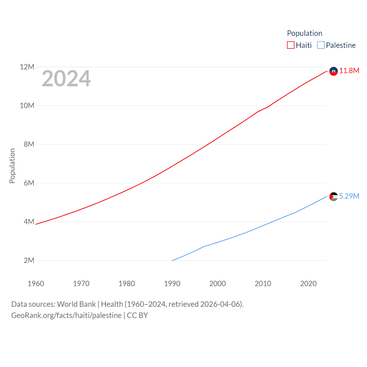 Haiti has a population of 11.8M (ranked 83/197), compared with 5.29M in Palestine (ranked 122/197). Haiti's land area is 10,641 sq mi versus 2,326 sq mi for Palestine (ranked 142nd vs. 164th).