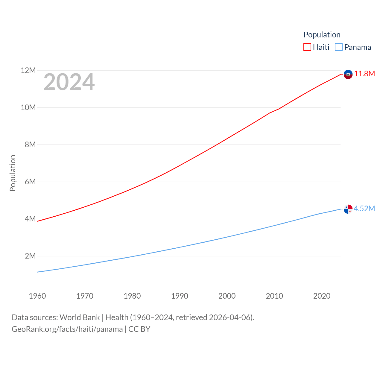 Haiti has a population of 11.8M (ranked 83/197), compared with 4.52M in Panama (ranked 128/197). Haiti's land area is 10,641 sq mi versus 28,641 sq mi for Panama (ranked 142nd vs. 115th).