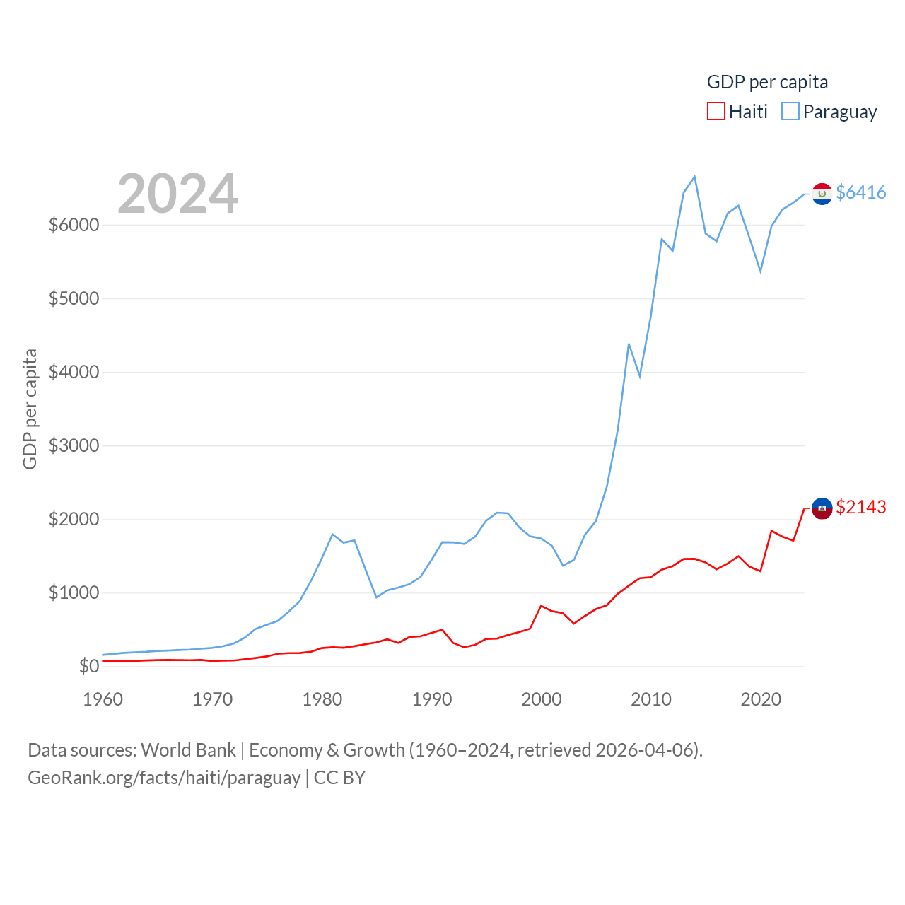 By GDP, Haiti ranks 117/197 ($25.2B) and Paraguay ranks 98/197 ($44.5B). By GDP per capita, Haiti ranks 153/197 ($2,143), while Paraguay ranks 109/197 ($6,416).