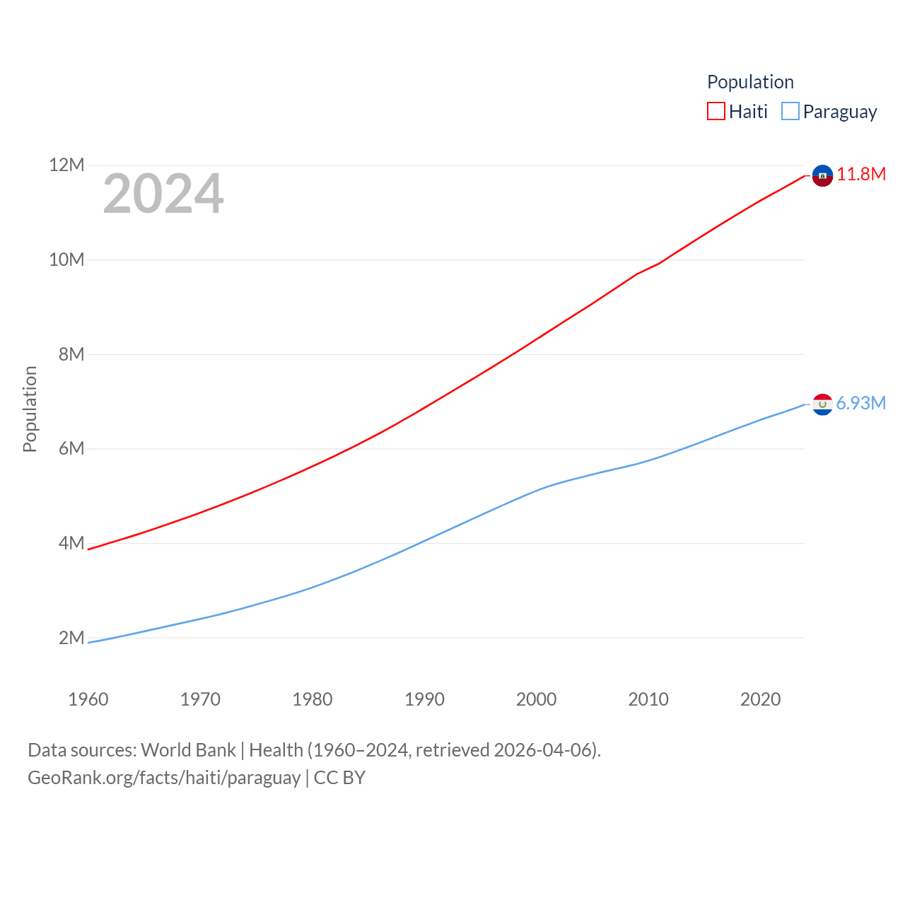 Haiti has a population of 11.8M (ranked 83/197), compared with 6.93M in Paraguay (ranked 107/197). Haiti's land area is 10,641 sq mi versus 152,901 sq mi for Paraguay (ranked 142nd vs. 59th).