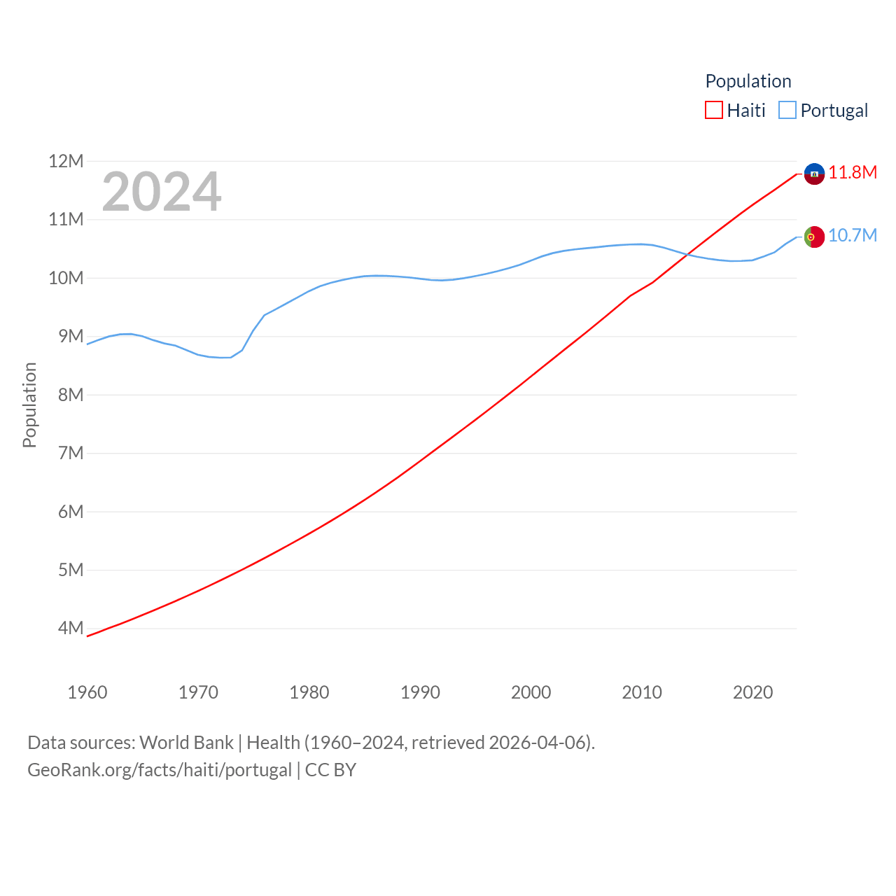 Haiti has a population of 11.8M (ranked 83/197), compared with 10.7M in Portugal (ranked 90/197). Haiti's land area is 10,641 sq mi versus 35,369 sq mi for Portugal (ranked 142nd vs. 108th).