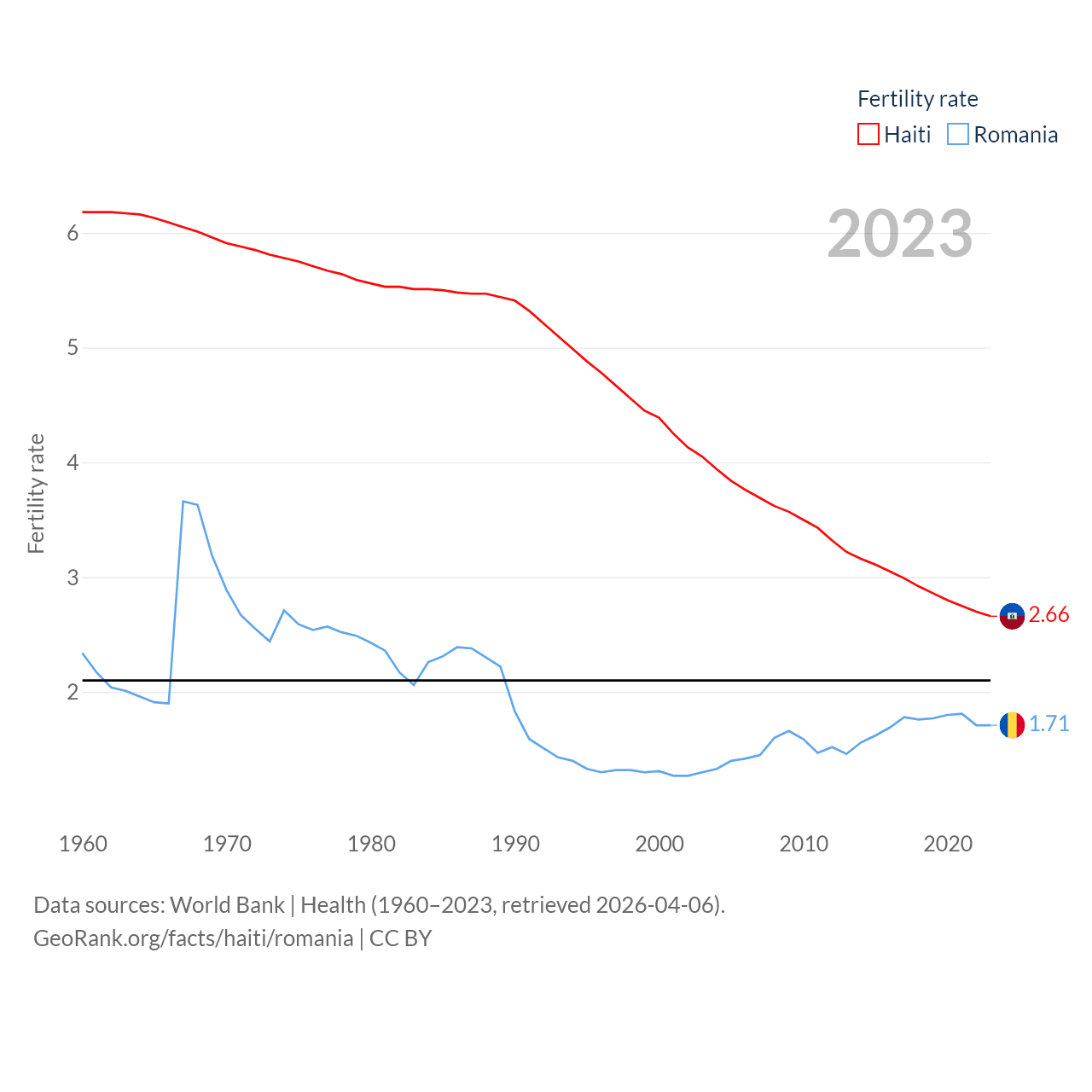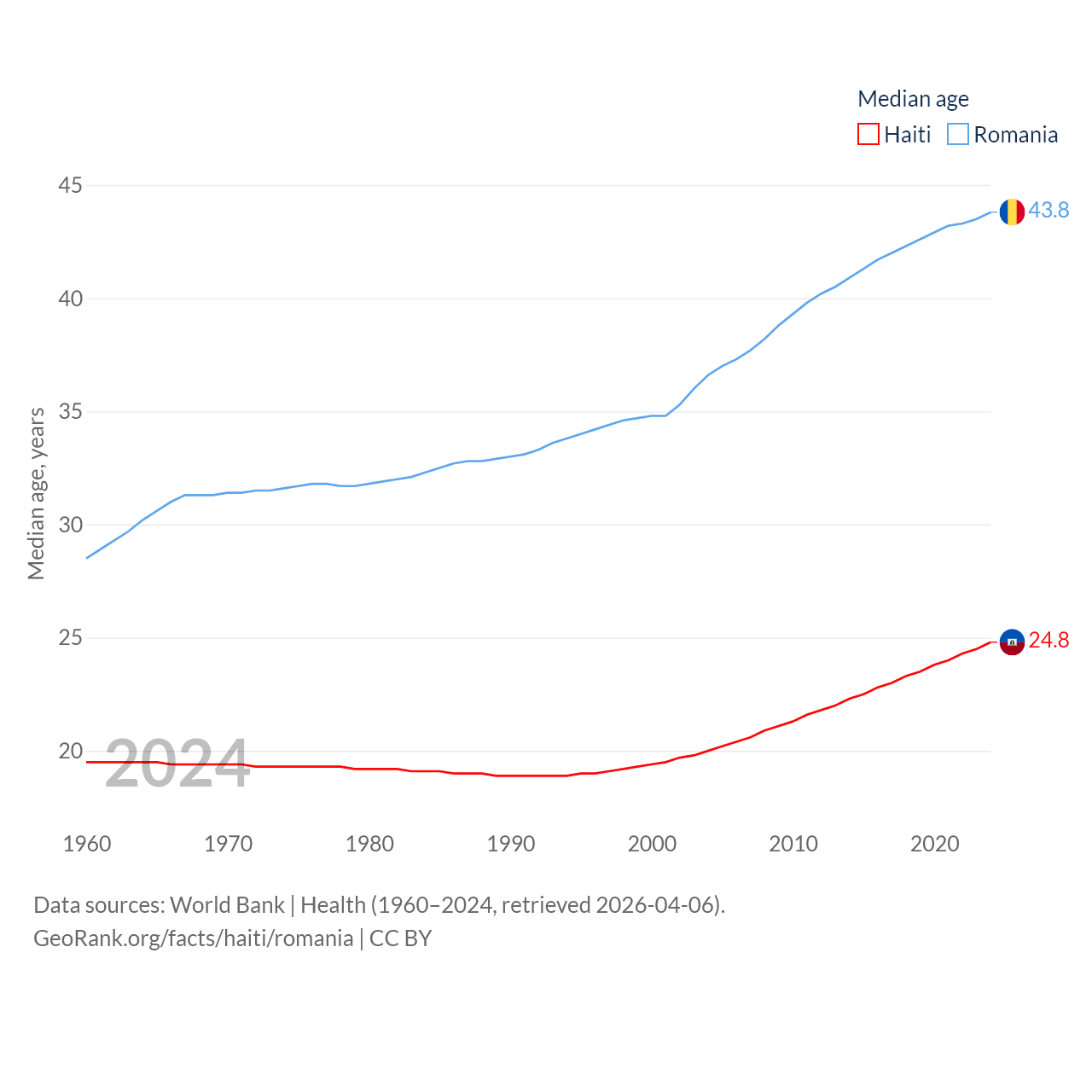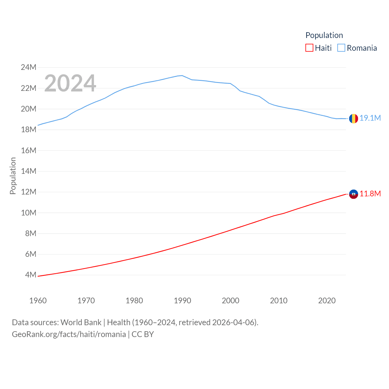 Haiti has a population of 11.8M (ranked 83/197), compared with 19.1M in Romania (ranked 67/197). Haiti's land area is 10,641 sq mi versus 88,834 sq mi for Romania (ranked 142nd vs. 80th).
