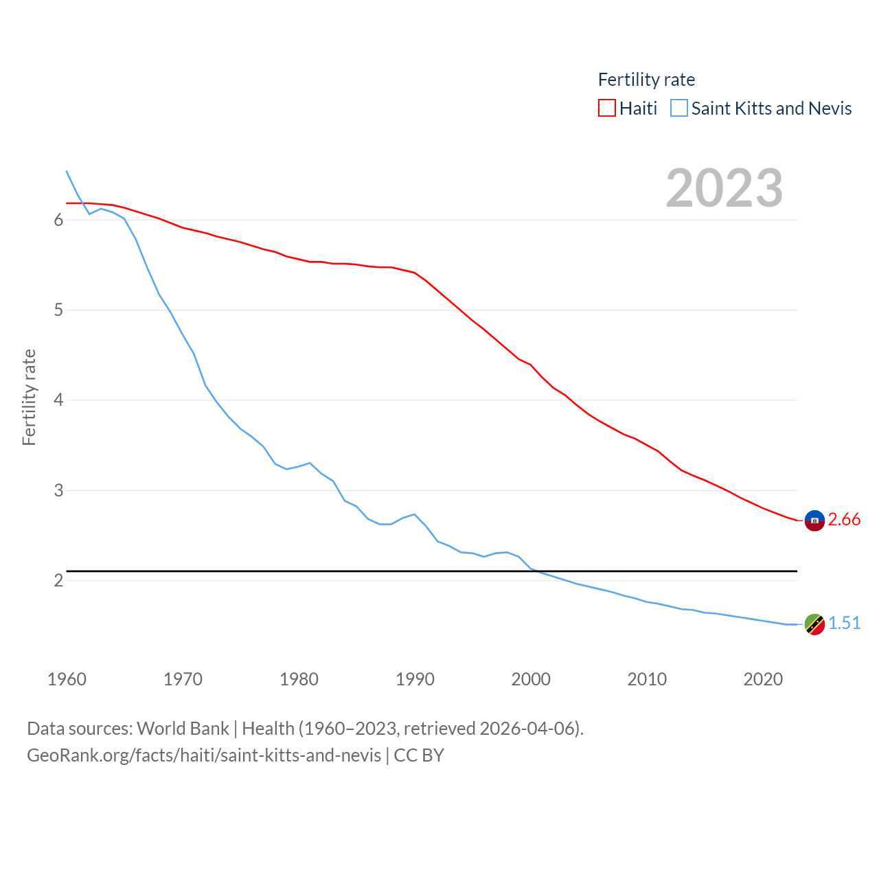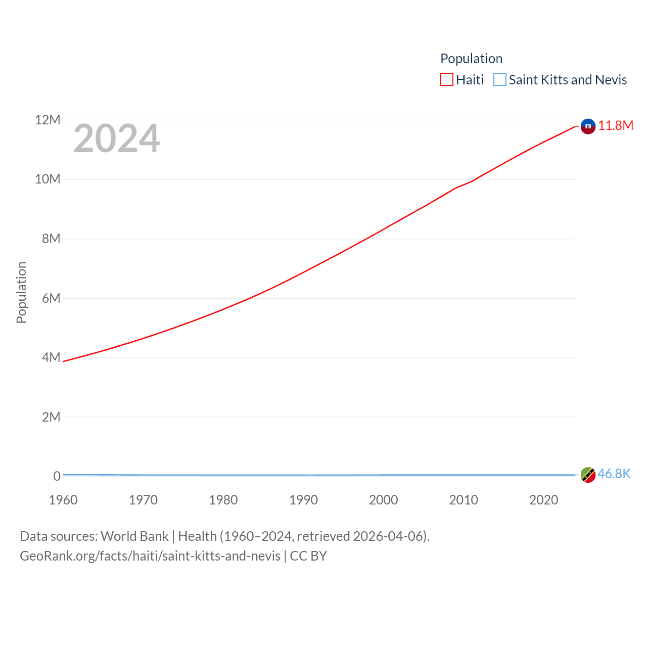Haiti has a population of 11.8M (ranked 83/197), compared with 46.8K in Saint Kitts and Nevis (ranked 189/197). Haiti's land area is 10,641 sq mi versus 100.4 sq mi for Saint Kitts and Nevis (ranked 142nd vs. 189th).