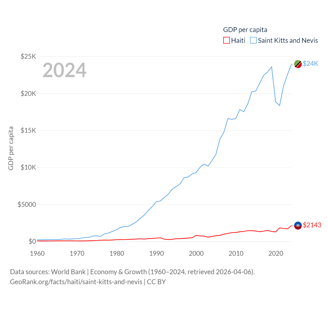 By GDP, Haiti ranks 117/197 ($25.2B) and Saint Kitts and Nevis ranks 187/197 ($1.12B). By GDP per capita, Haiti ranks 153/197 ($2,143), while Saint Kitts and Nevis ranks 51/197 ($23,961).