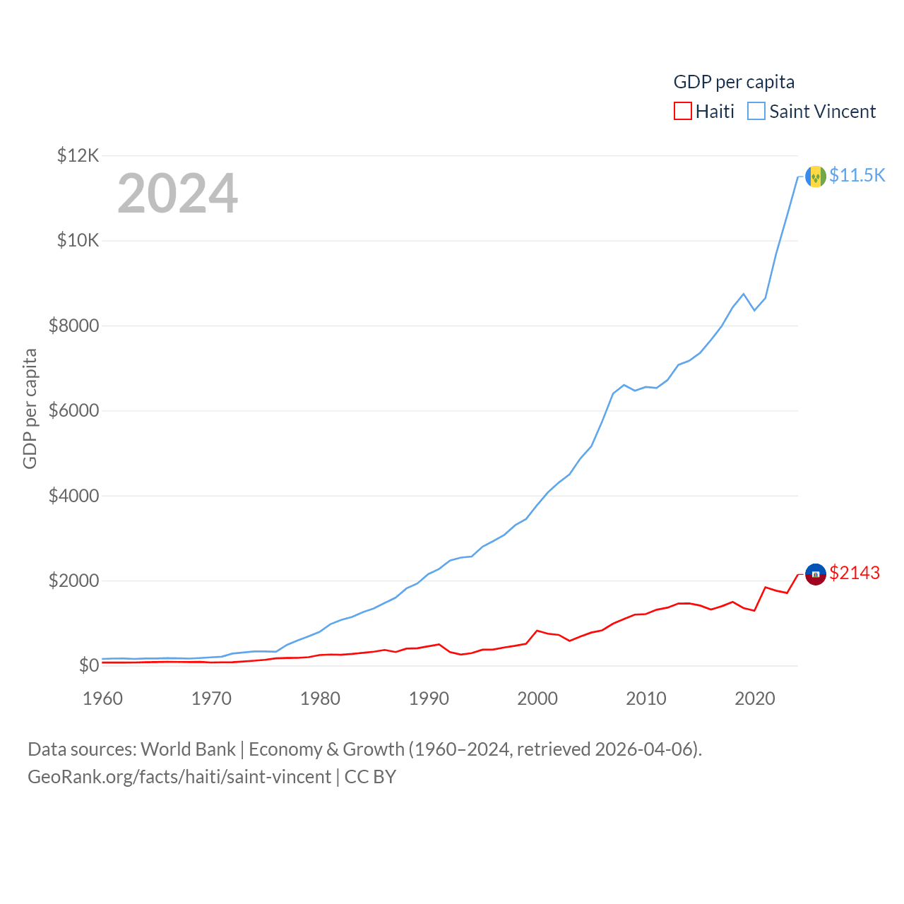 By GDP, Haiti ranks 117/197 ($25.2B) and Saint Vincent ranks 186/197 ($1.16B). By GDP per capita, Haiti ranks 153/197 ($2,143), while Saint Vincent ranks 81/197 ($11,501).