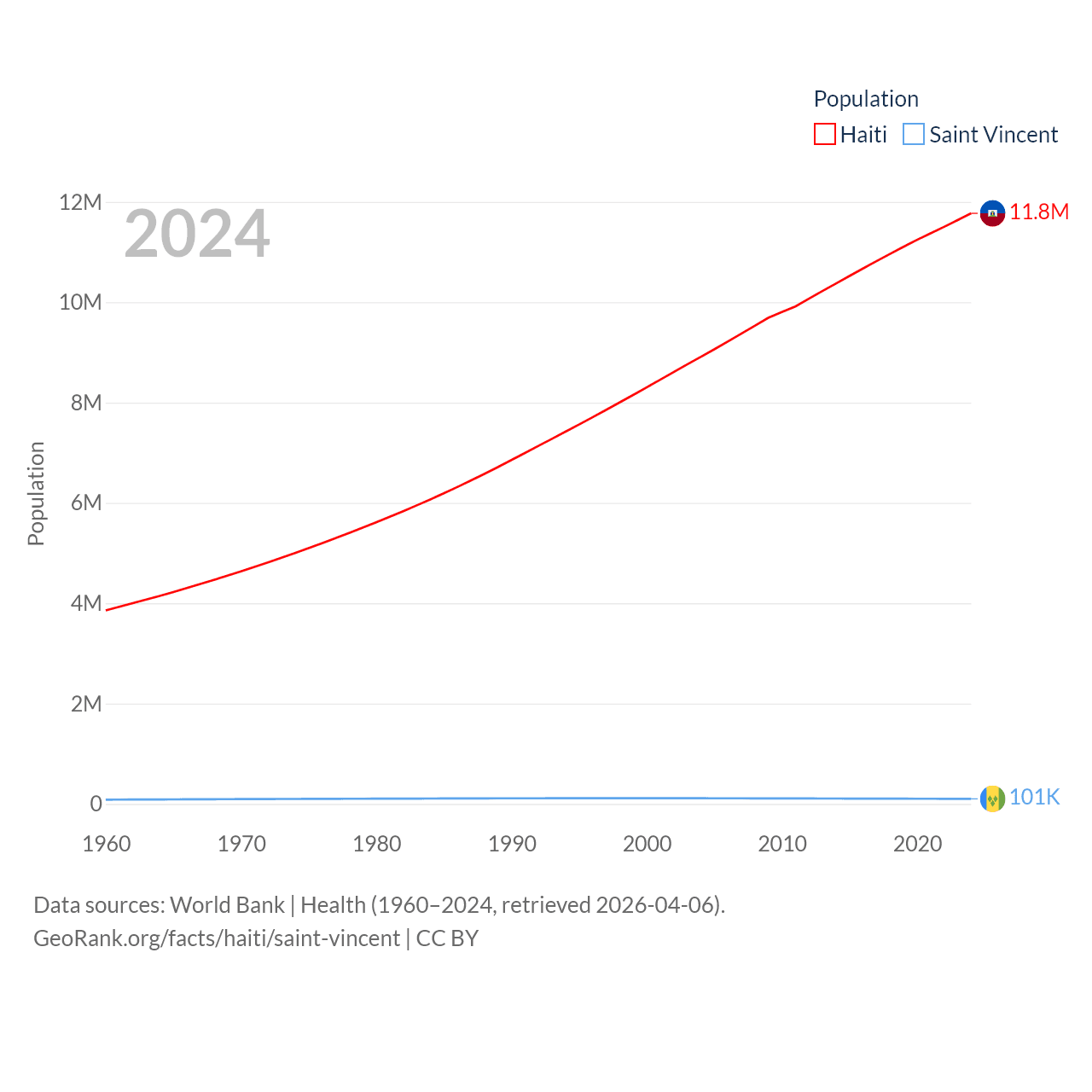 Haiti has a population of 11.8M (ranked 83/197), compared with 101K in Saint Vincent (ranked 184/197). Haiti's land area is 10,641 sq mi versus 150.6 sq mi for Saint Vincent (ranked 142nd vs. 185th).