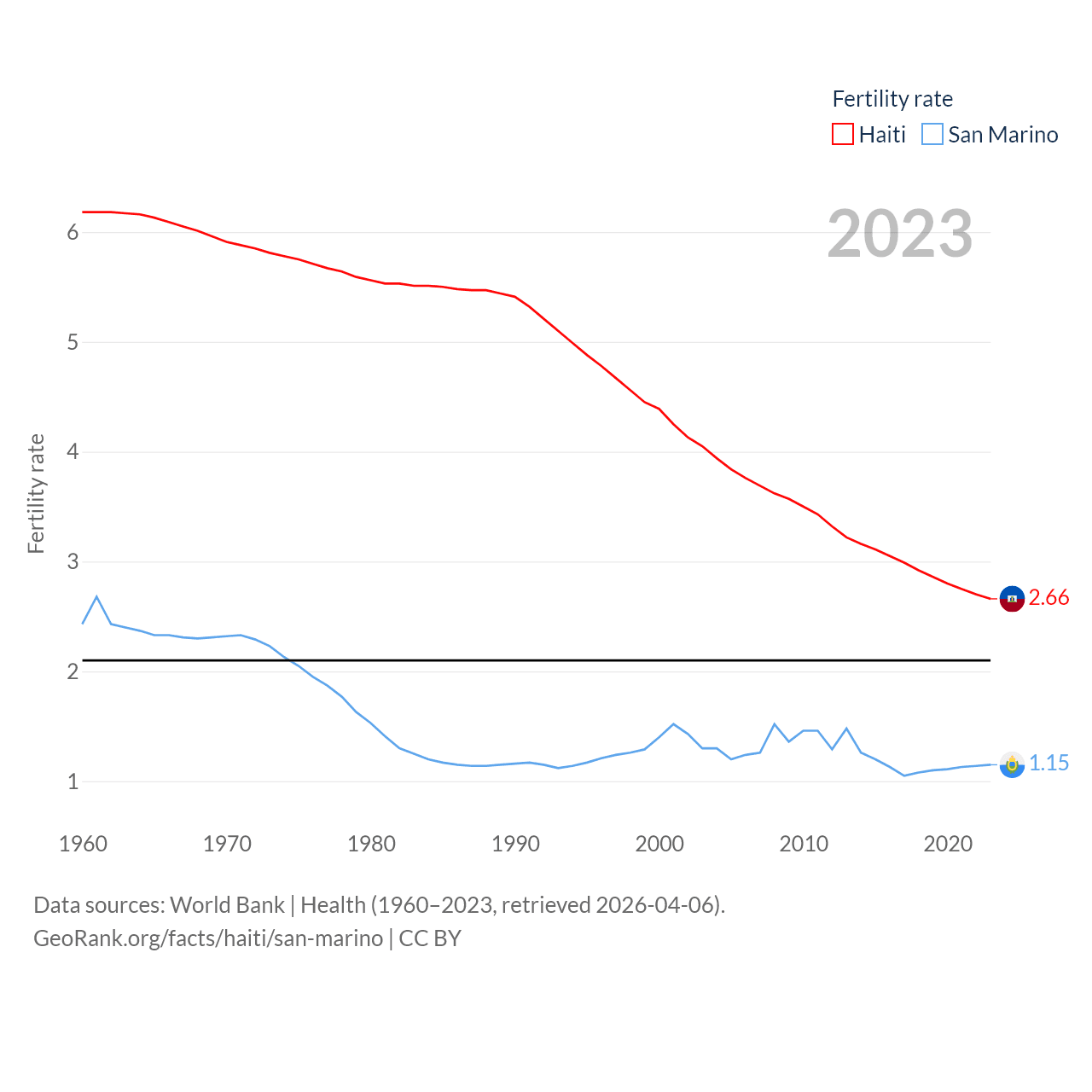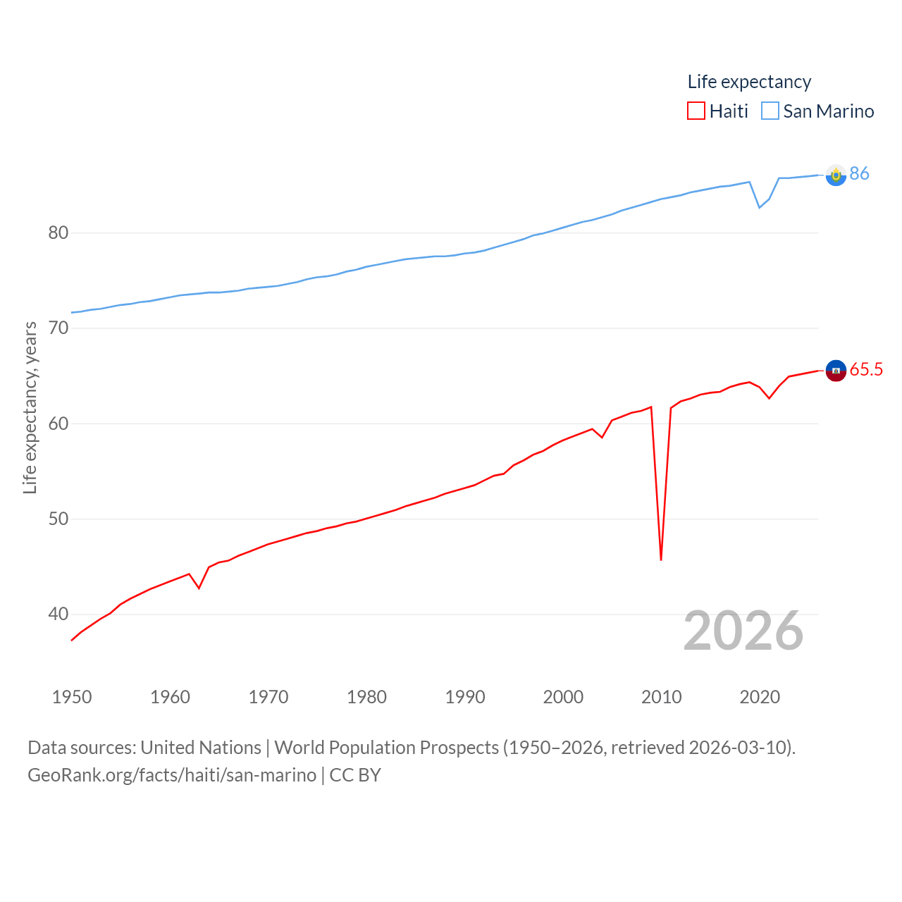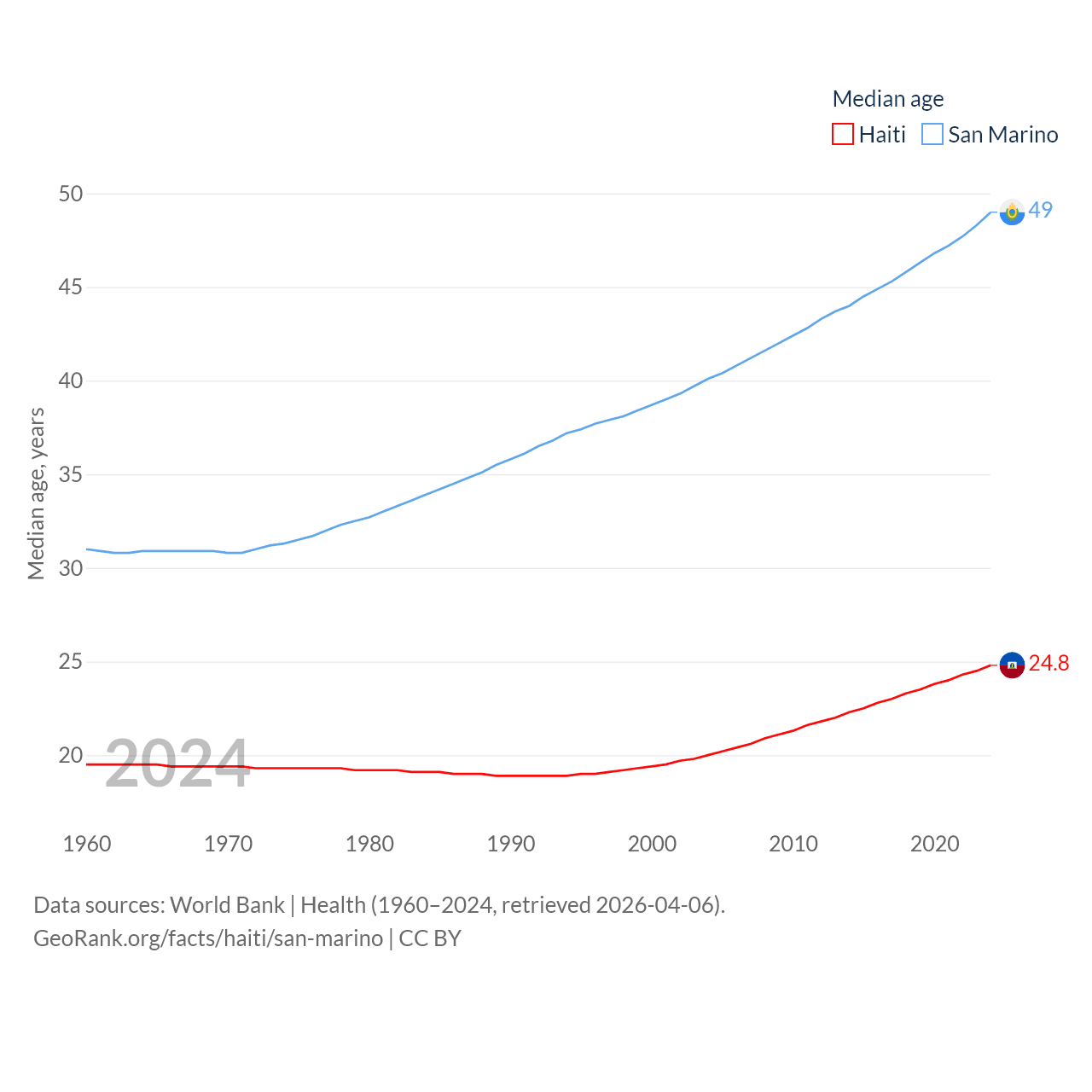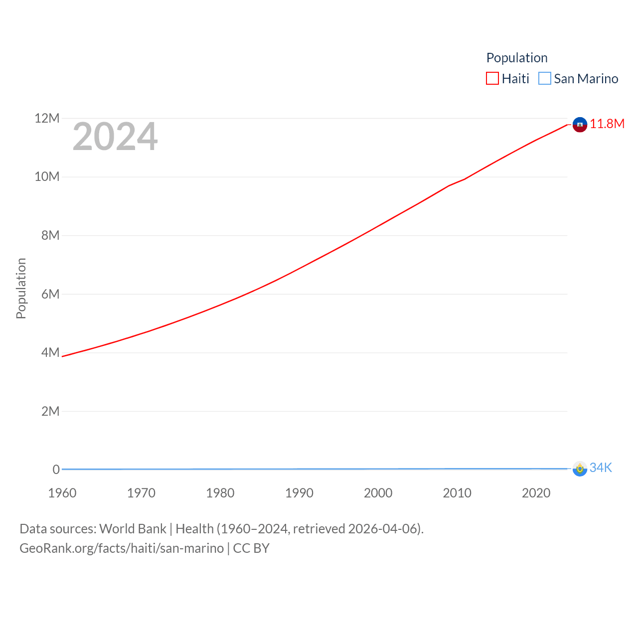 Haiti has a population of 11.8M (ranked 83/197), compared with 34K in San Marino (ranked 193/197). Haiti's land area is 10,641 sq mi versus 23.2 sq mi for San Marino (ranked 142nd vs. 193rd).