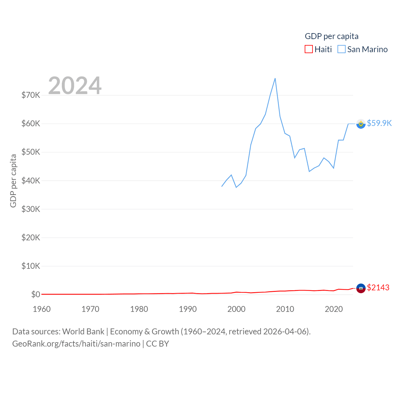 By GDP, Haiti ranks 117/197 ($25.2B) and San Marino ranks 180/197 ($2.03B). By GDP per capita, Haiti ranks 153/197 ($2,143), while San Marino ranks 15/197 ($59,880).