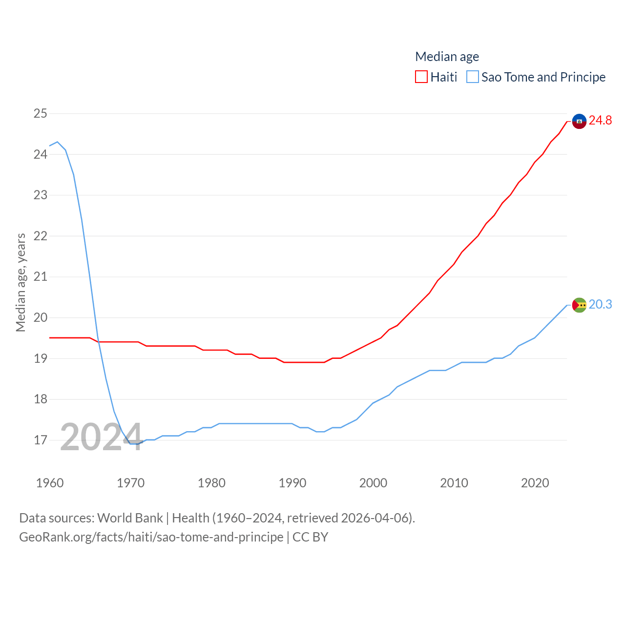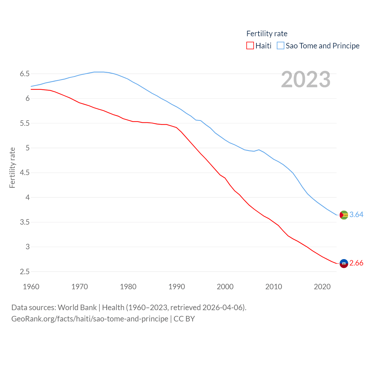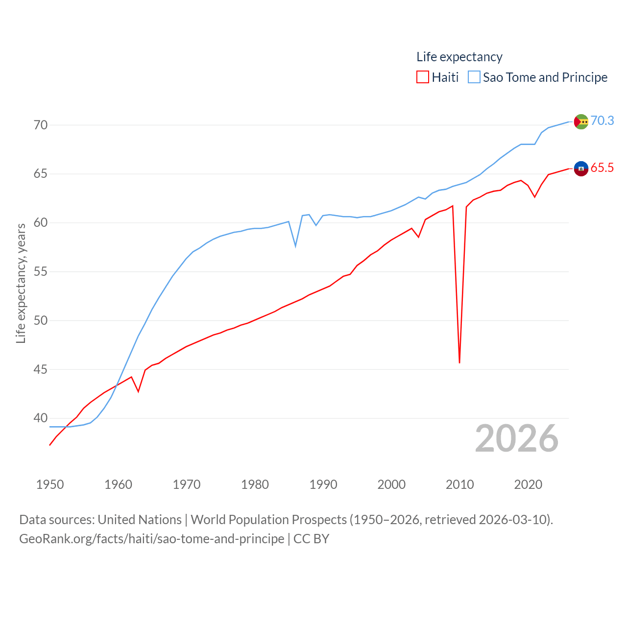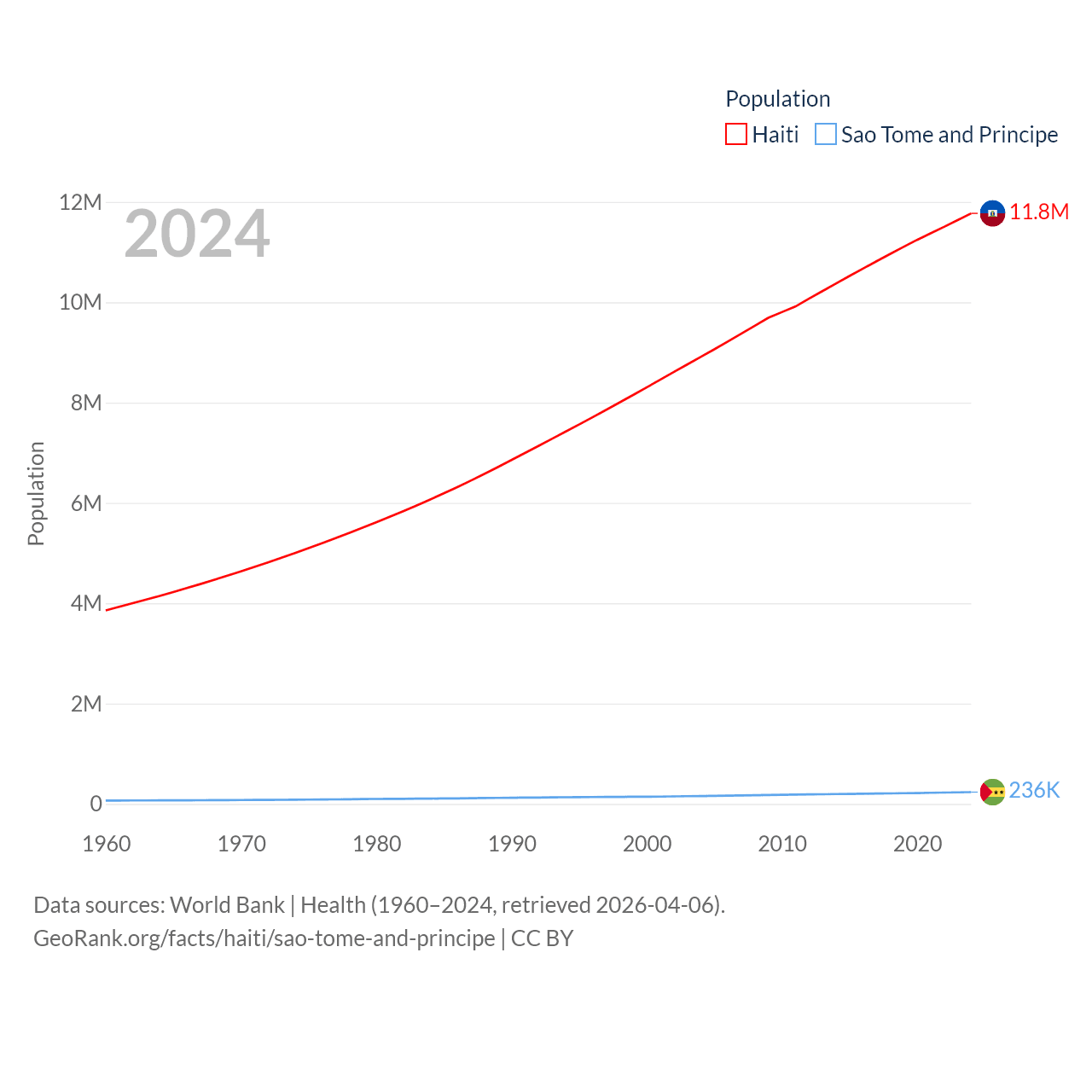 Haiti has a population of 11.8M (ranked 83/197), compared with 236K in Sao Tome and Principe (ranked 176/197). Haiti's land area is 10,641 sq mi versus 371 sq mi for Sao Tome and Principe (ranked 142nd vs. 172nd).