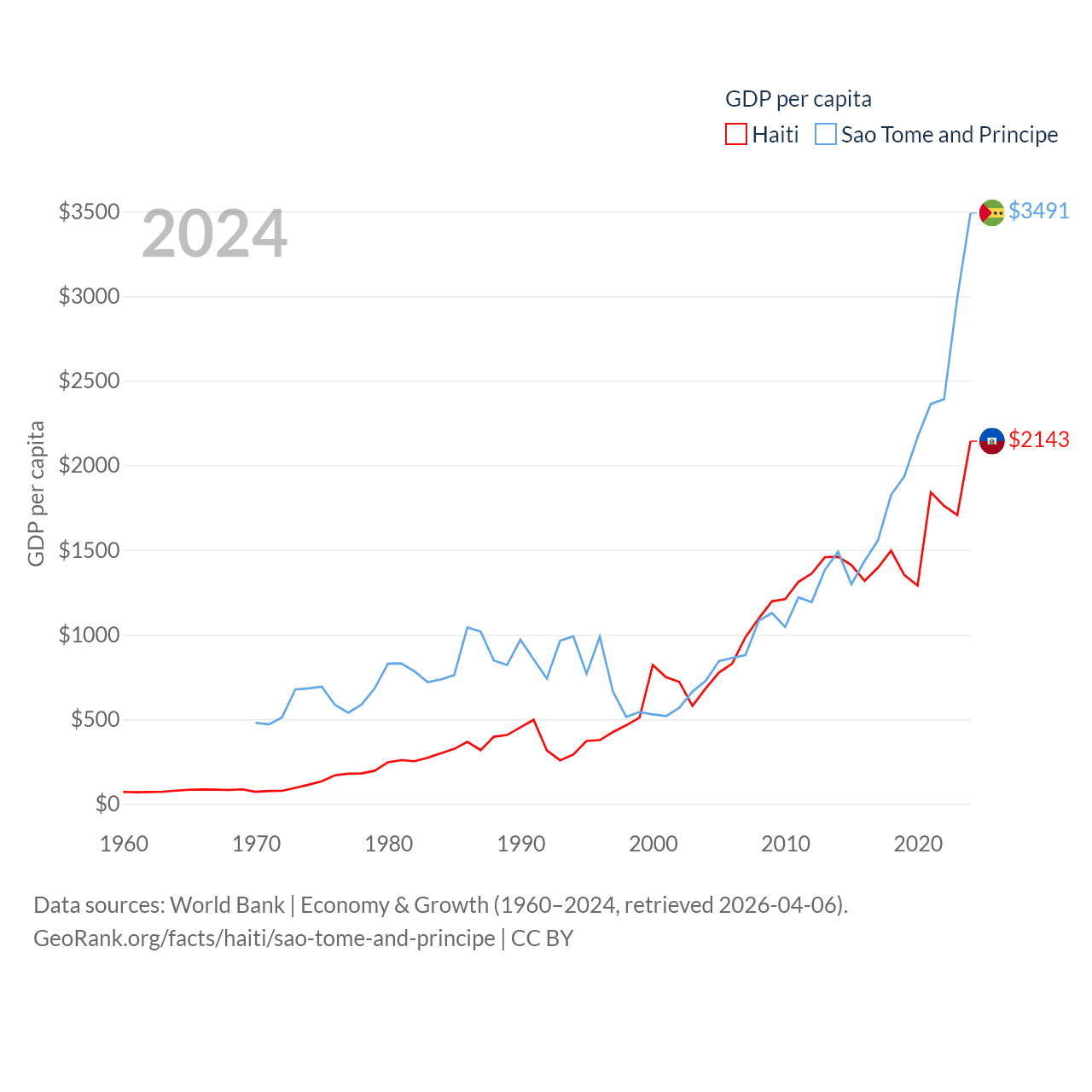 By GDP, Haiti ranks 117/197 ($25.2B) and Sao Tome and Principe ranks 189/197 ($822M). By GDP per capita, Haiti ranks 153/197 ($2,143), while Sao Tome and Principe ranks 134/197 ($3,491).