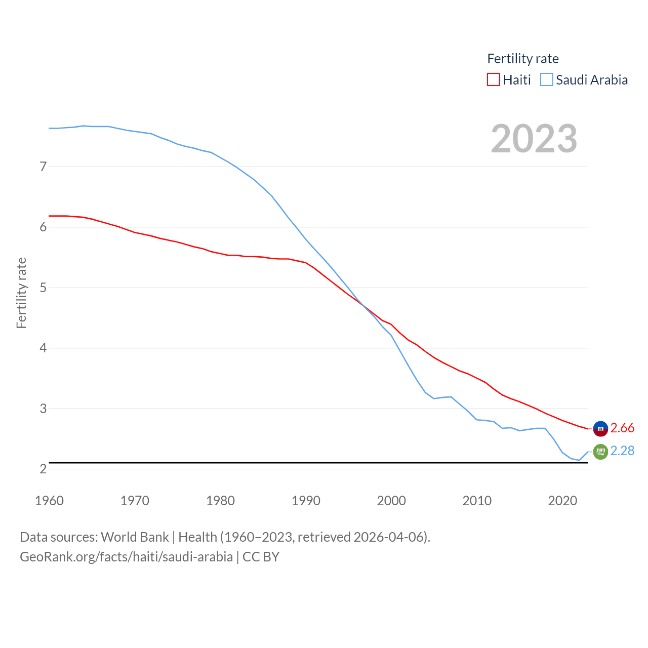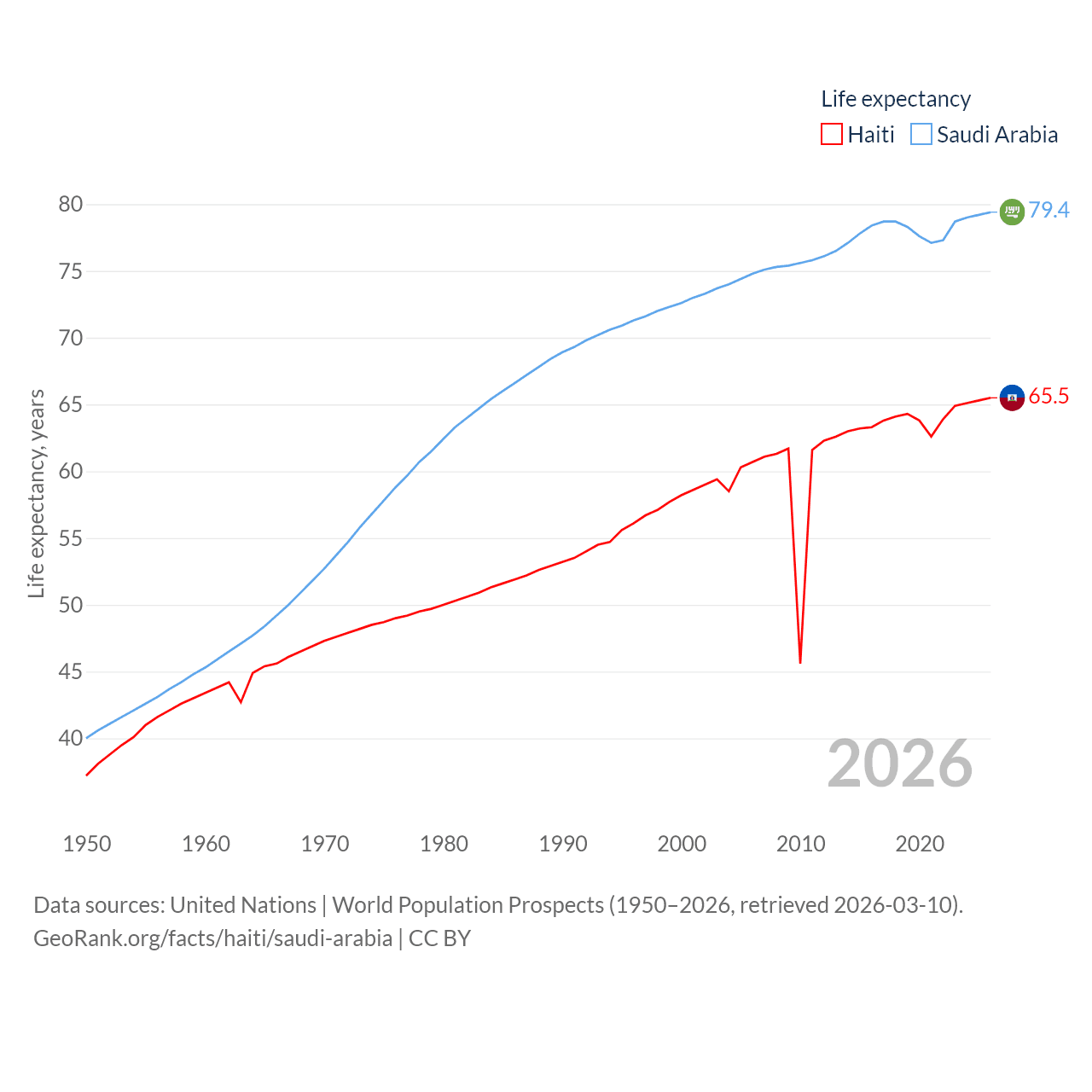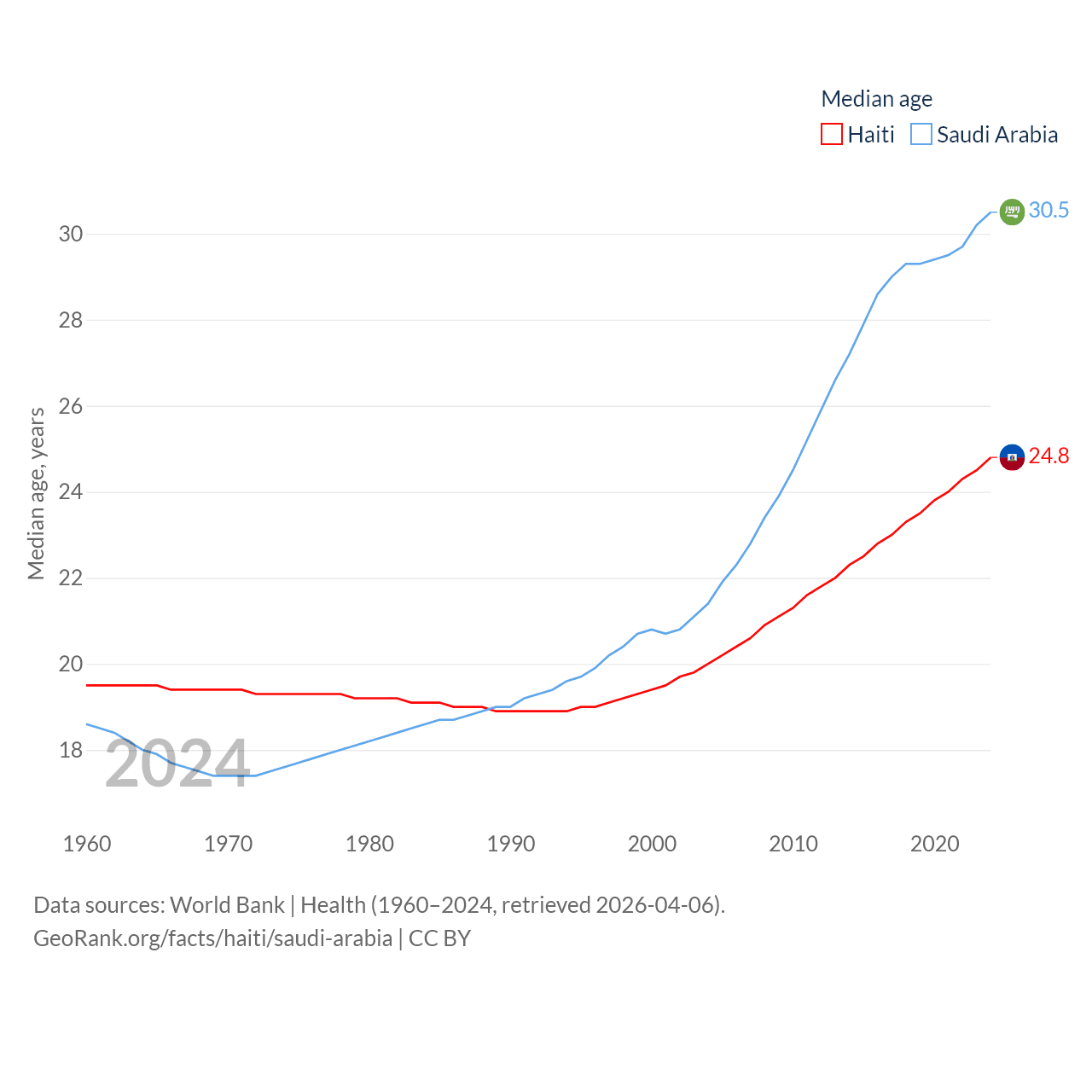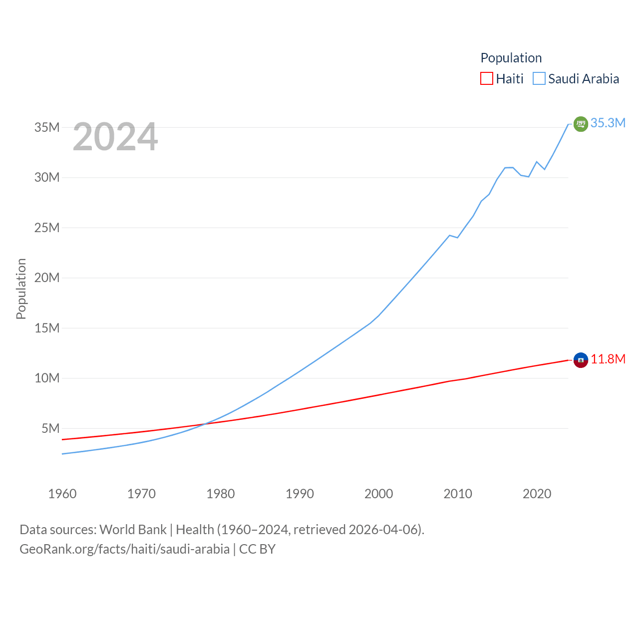 Haiti has a population of 11.8M (ranked 83/197), compared with 35.3M in Saudi Arabia (ranked 45/197). Haiti's land area is 10,641 sq mi versus 830,000 sq mi for Saudi Arabia (ranked 142nd vs. 12th).