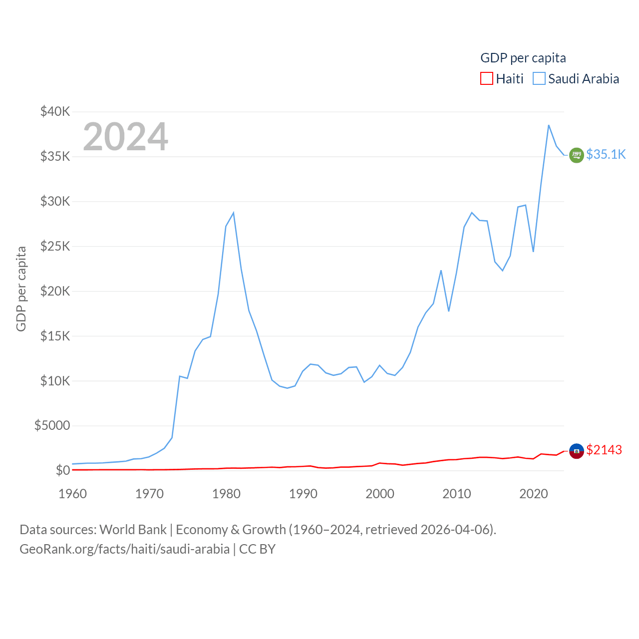 By GDP, Haiti ranks 117/197 ($25.2B) and Saudi Arabia ranks 18/197 ($1.24T). By GDP per capita, Haiti ranks 153/197 ($2,143), while Saudi Arabia ranks 33/197 ($35,122).