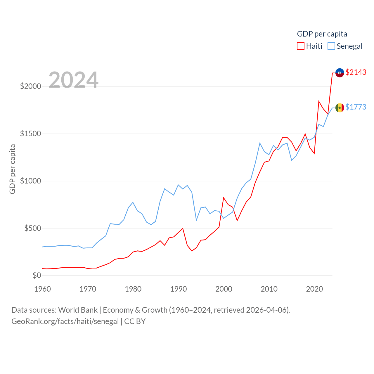By GDP, Haiti ranks 117/197 ($25.2B) and Senegal ranks 109/197 ($32.8B). By GDP per capita, Haiti ranks 153/197 ($2,143), while Senegal ranks 159/197 ($1,773).