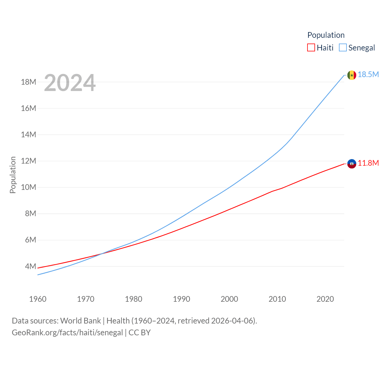 Haiti has a population of 11.8M (ranked 83/197), compared with 18.5M in Senegal (ranked 69/197). Haiti's land area is 10,641 sq mi versus 74,336 sq mi for Senegal (ranked 142nd vs. 85th).
