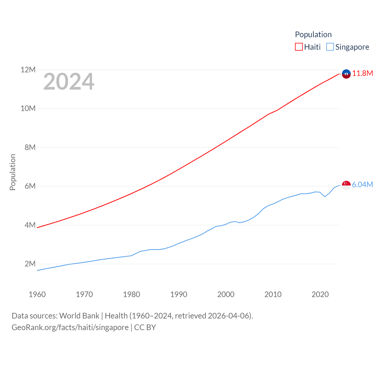 Haiti has a population of 11.8M (ranked 83/197), compared with 6.04M in Singapore (ranked 113/197). Haiti's land area is 10,641 sq mi versus 277.2 sq mi for Singapore (ranked 142nd vs. 177th).