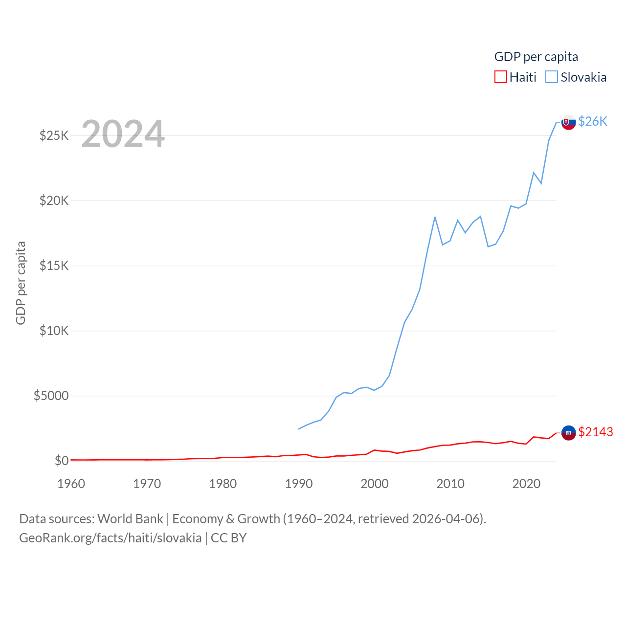 By GDP, Haiti ranks 117/197 ($25.2B) and Slovakia ranks 61/197 ($141B). By GDP per capita, Haiti ranks 153/197 ($2,143), while Slovakia ranks 47/197 ($25,993).