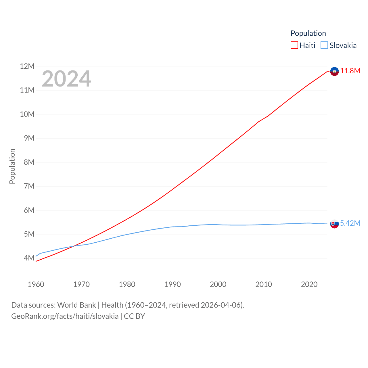 Haiti has a population of 11.8M (ranked 83/197), compared with 5.42M in Slovakia (ranked 119/197). Haiti's land area is 10,641 sq mi versus 18,564 sq mi for Slovakia (ranked 142nd vs. 128th).
