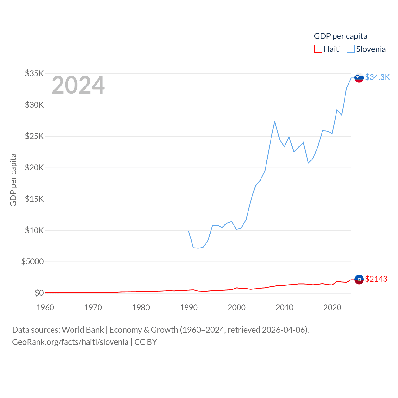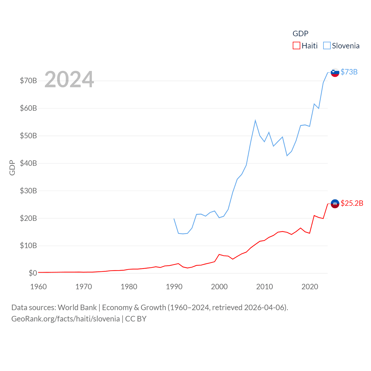 By GDP, Haiti ranks 117/197 ($25.2B) and Slovenia ranks 86/197 ($73B). By GDP per capita, Haiti ranks 153/197 ($2,143), while Slovenia ranks 34/197 ($34,301).
