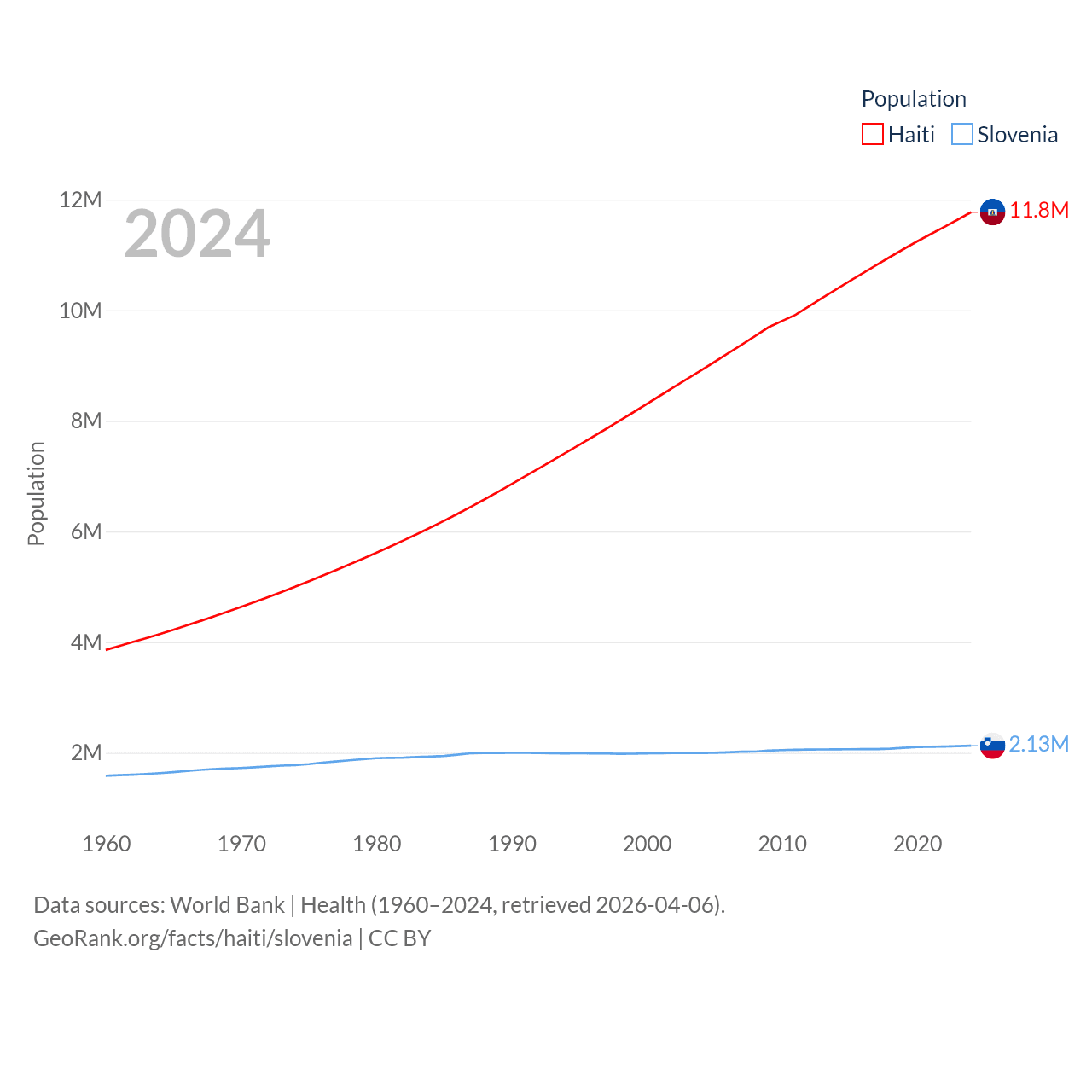 Haiti has a population of 11.8M (ranked 83/197), compared with 2.13M in Slovenia (ranked 147/197). Haiti's land area is 10,641 sq mi versus 7,774 sq mi for Slovenia (ranked 142nd vs. 151st).