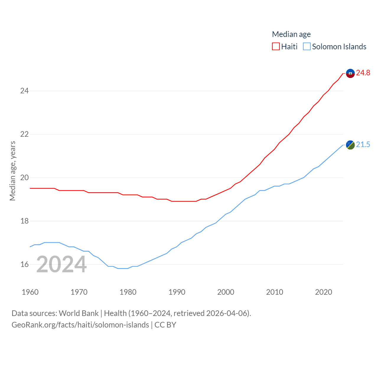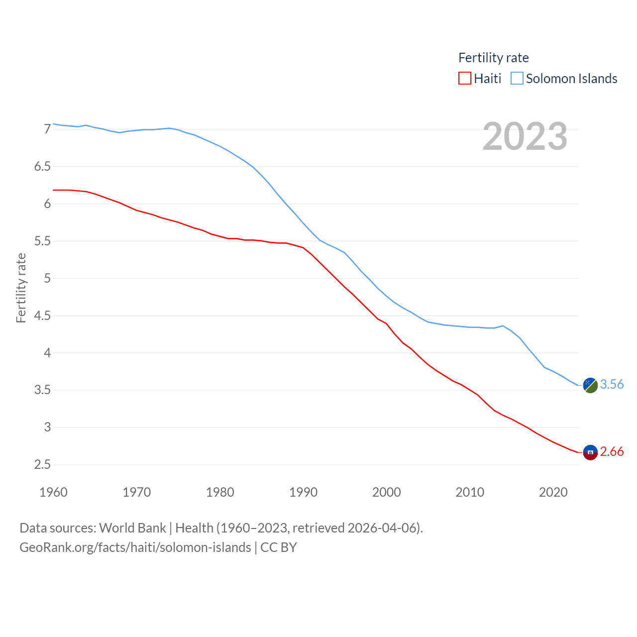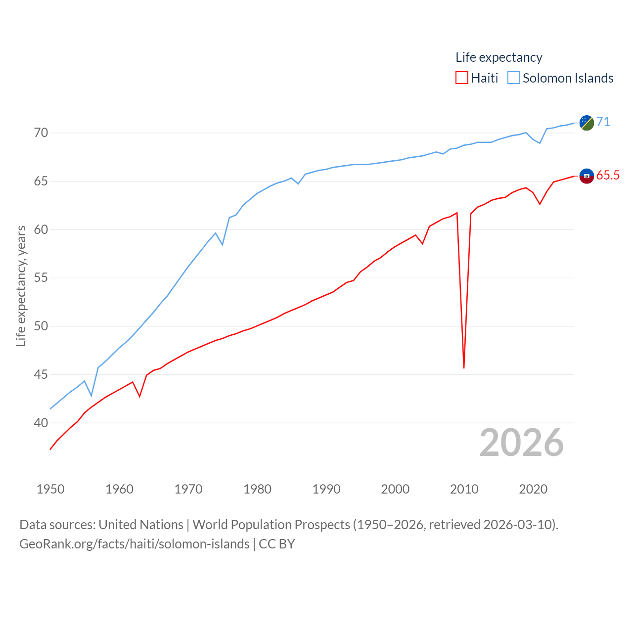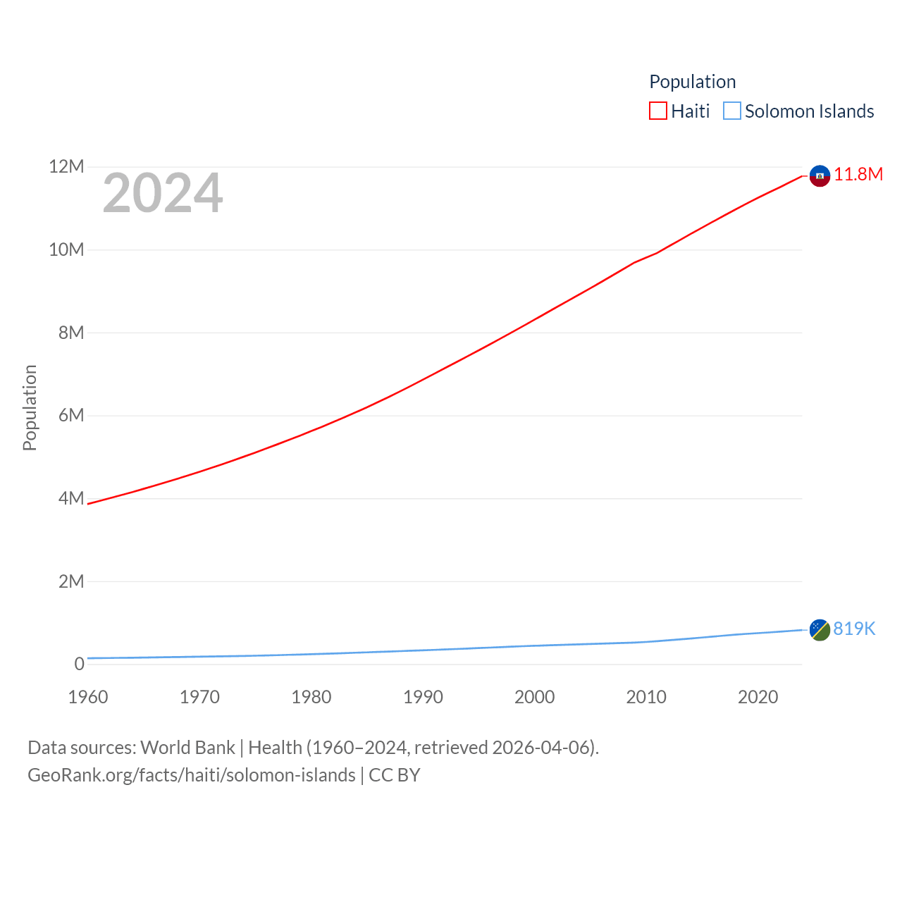 Haiti has a population of 11.8M (ranked 83/197), compared with 819K in The Solomon Islands (ranked 162/197). Haiti's land area is 10,641 sq mi versus 10,807 sq mi for The Solomon Islands (ranked 142nd vs. 141st).
