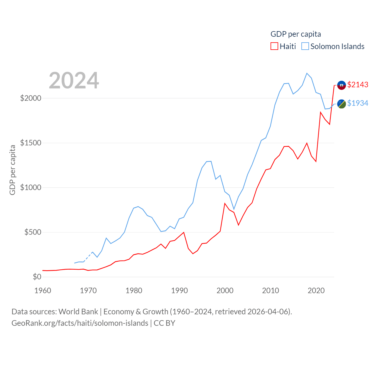 By GDP, Haiti ranks 117/197 ($25.2B) and The Solomon Islands ranks 182/197 ($1.58B). By GDP per capita, Haiti ranks 153/197 ($2,143), while The Solomon Islands ranks 157/197 ($1,934).