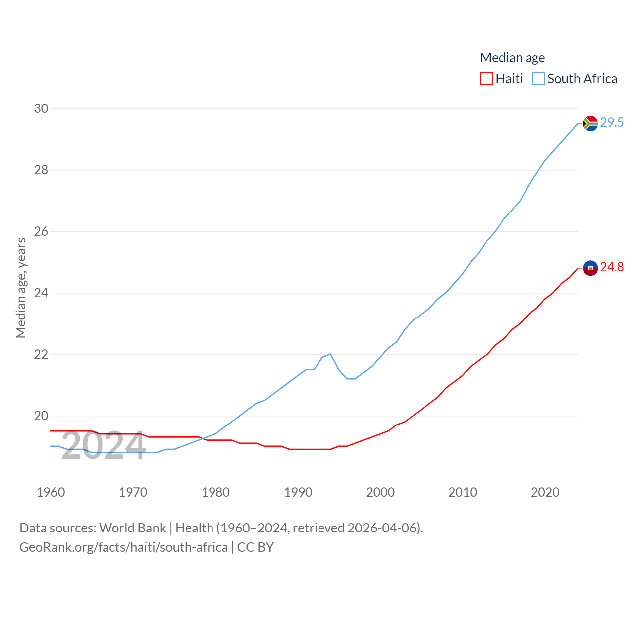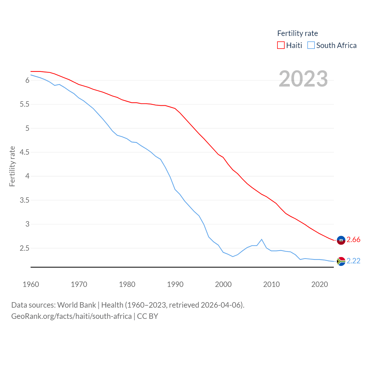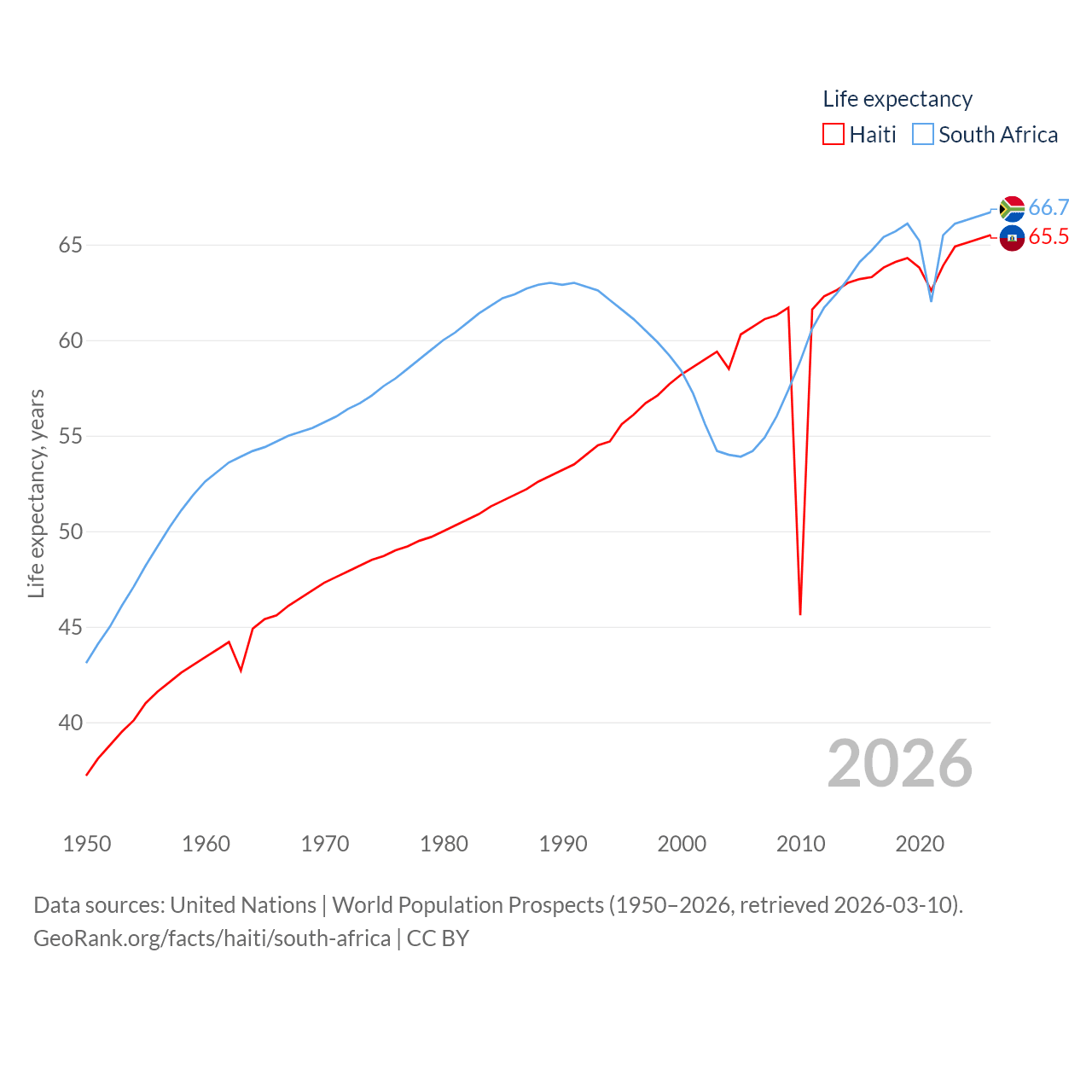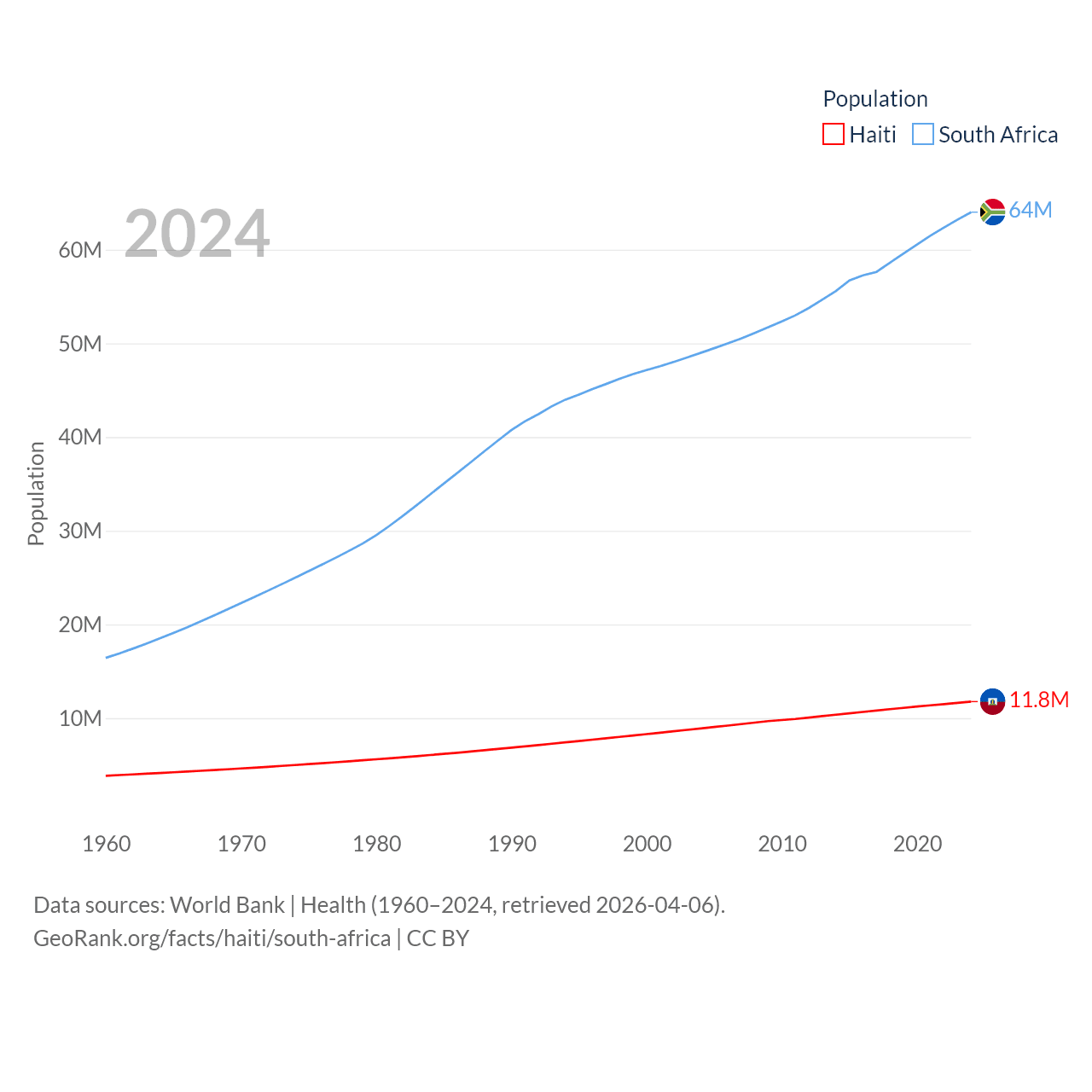 Haiti has a population of 11.8M (ranked 83/197), compared with 64M in South Africa (ranked 24/197). Haiti's land area is 10,641 sq mi versus 468,377 sq mi for South Africa (ranked 142nd vs. 24th).