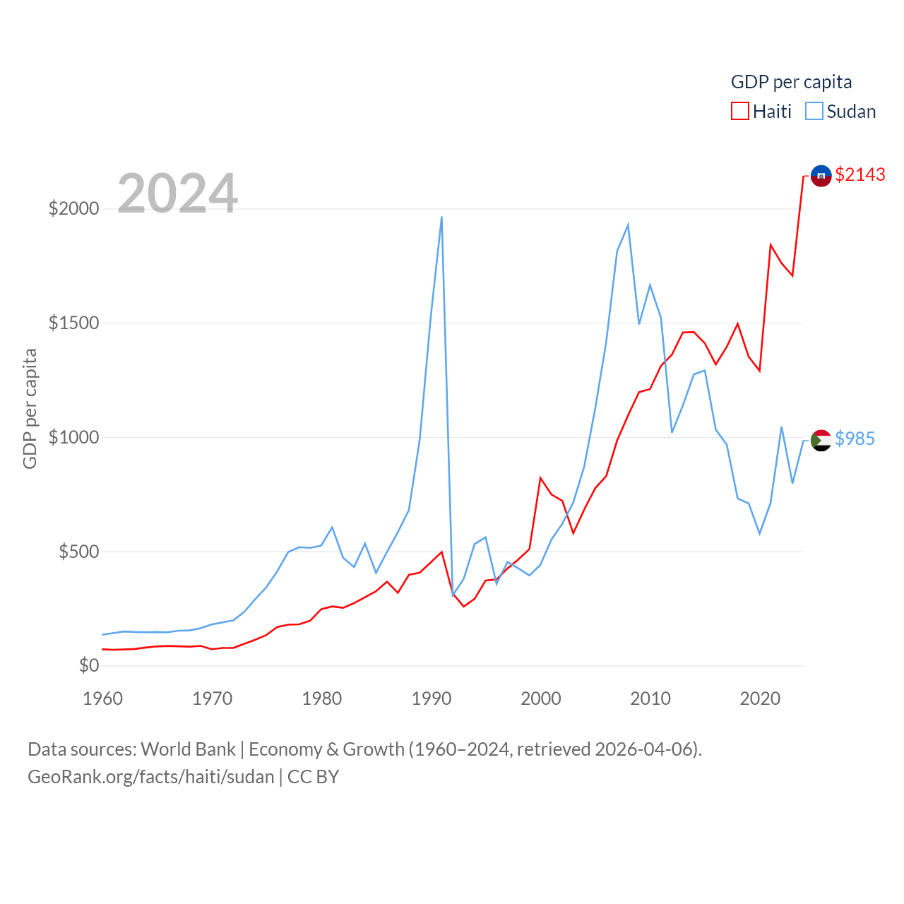By GDP, Haiti ranks 117/197 ($25.2B) and Sudan ranks 94/197 ($49.7B). By GDP per capita, Haiti ranks 153/197 ($2,143), while Sudan ranks 179/197 ($985).
