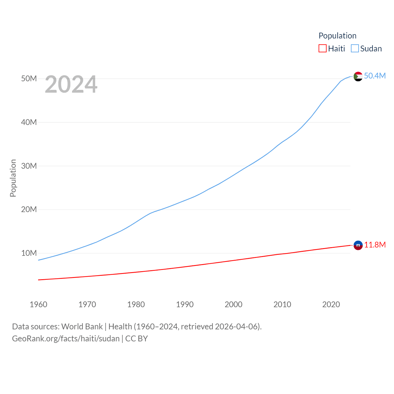 Haiti has a population of 11.8M (ranked 83/197), compared with 50.4M in Sudan (ranked 30/197). Haiti's land area is 10,641 sq mi versus 721,239 sq mi for Sudan (ranked 142nd vs. 15th).