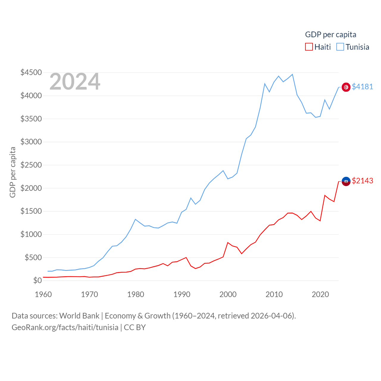 By GDP, Haiti ranks 117/197 ($25.2B) and Tunisia ranks 93/197 ($51.3B). By GDP per capita, Haiti ranks 153/197 ($2,143), while Tunisia ranks 129/197 ($4,181).