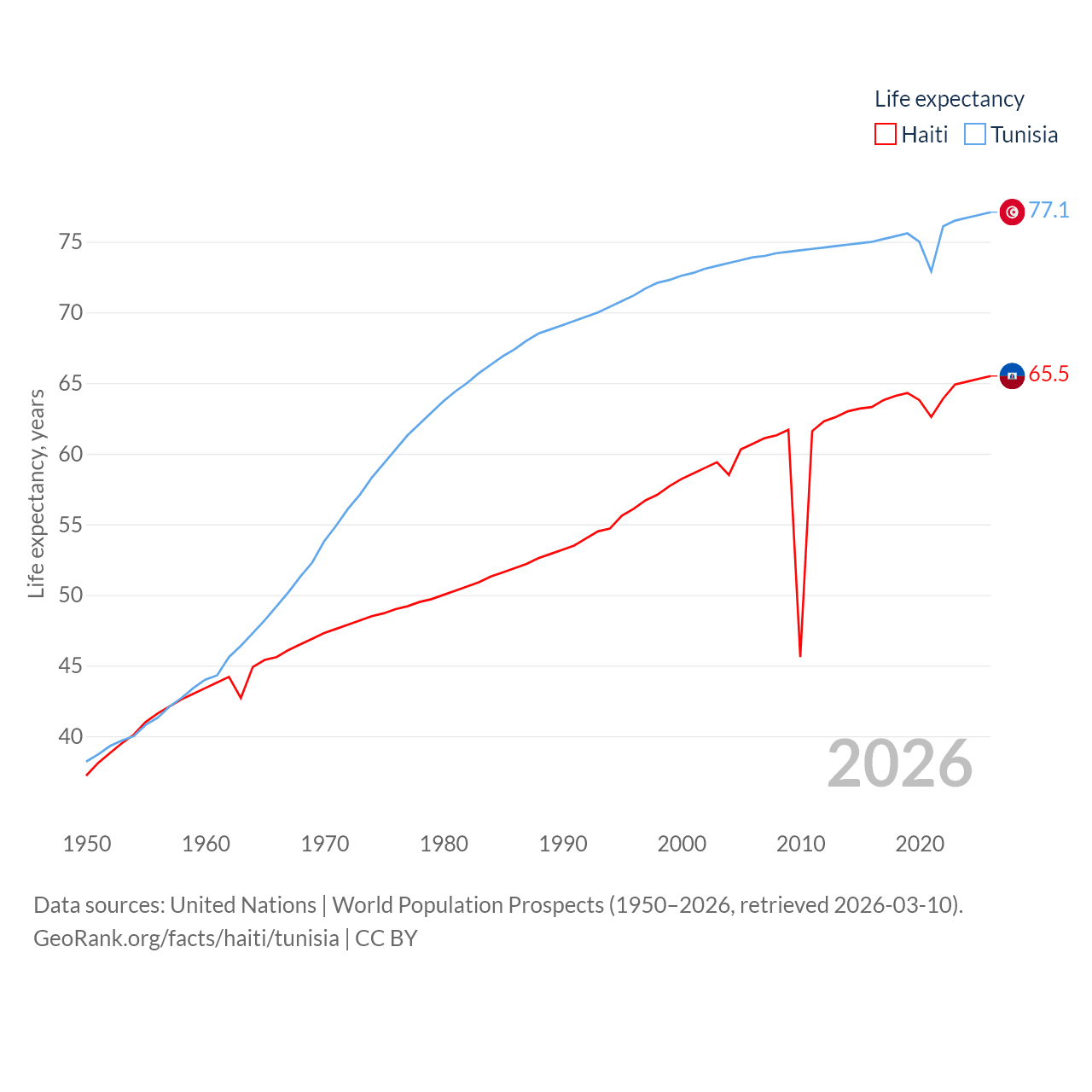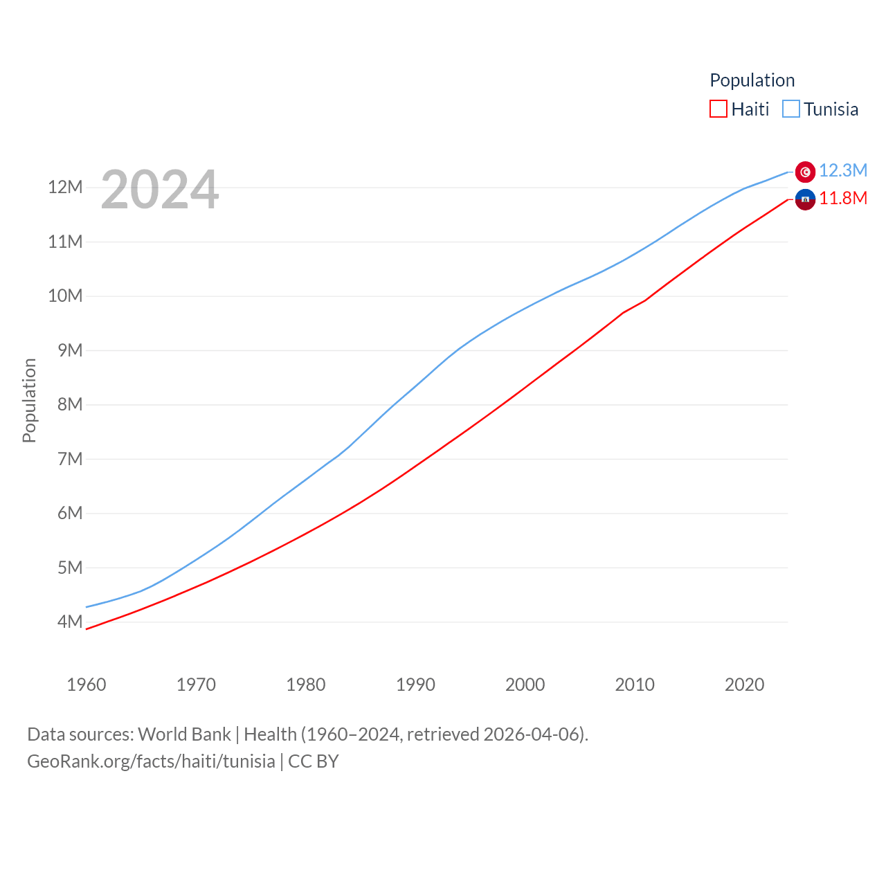 Haiti has a population of 11.8M (ranked 83/197), compared with 12.3M in Tunisia (ranked 80/197). Haiti's land area is 10,641 sq mi versus 59,985 sq mi for Tunisia (ranked 142nd vs. 91st).