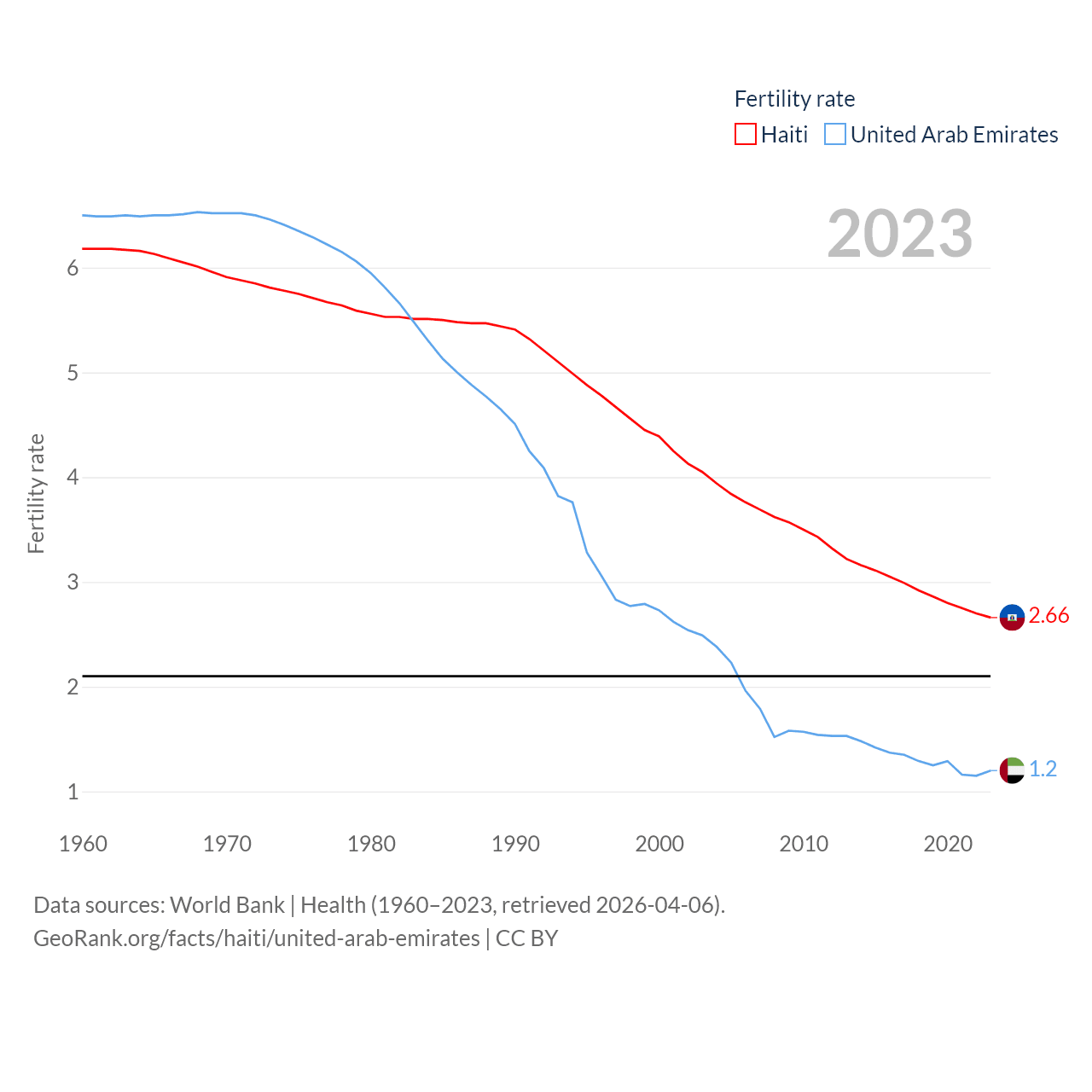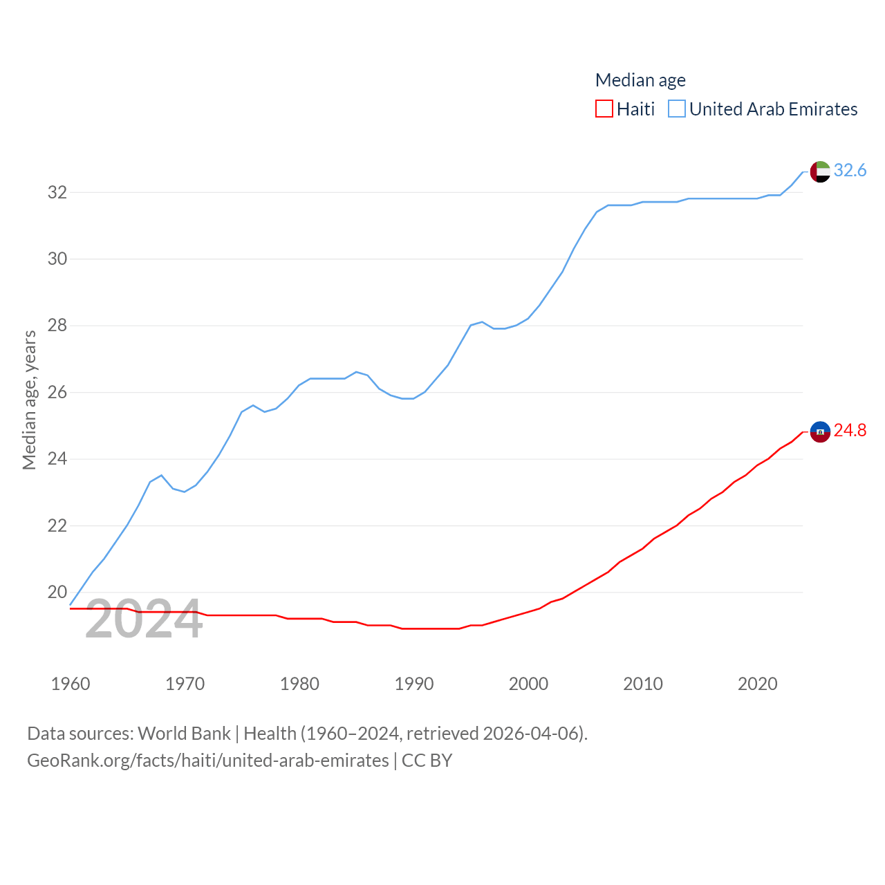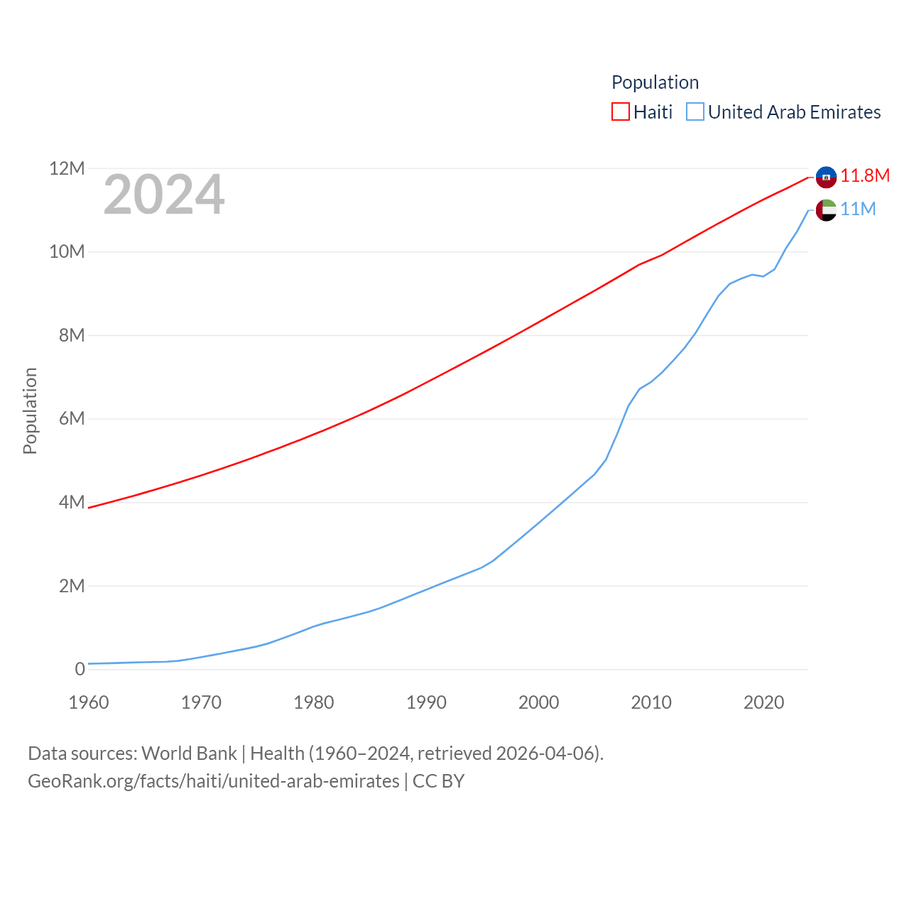 Haiti has a population of 11.8M (ranked 83/197), compared with 11M in The United Arab Emirates (ranked 86/197). Haiti's land area is 10,641 sq mi versus 27,421 sq mi for The United Arab Emirates (ranked 142nd vs. 117th).