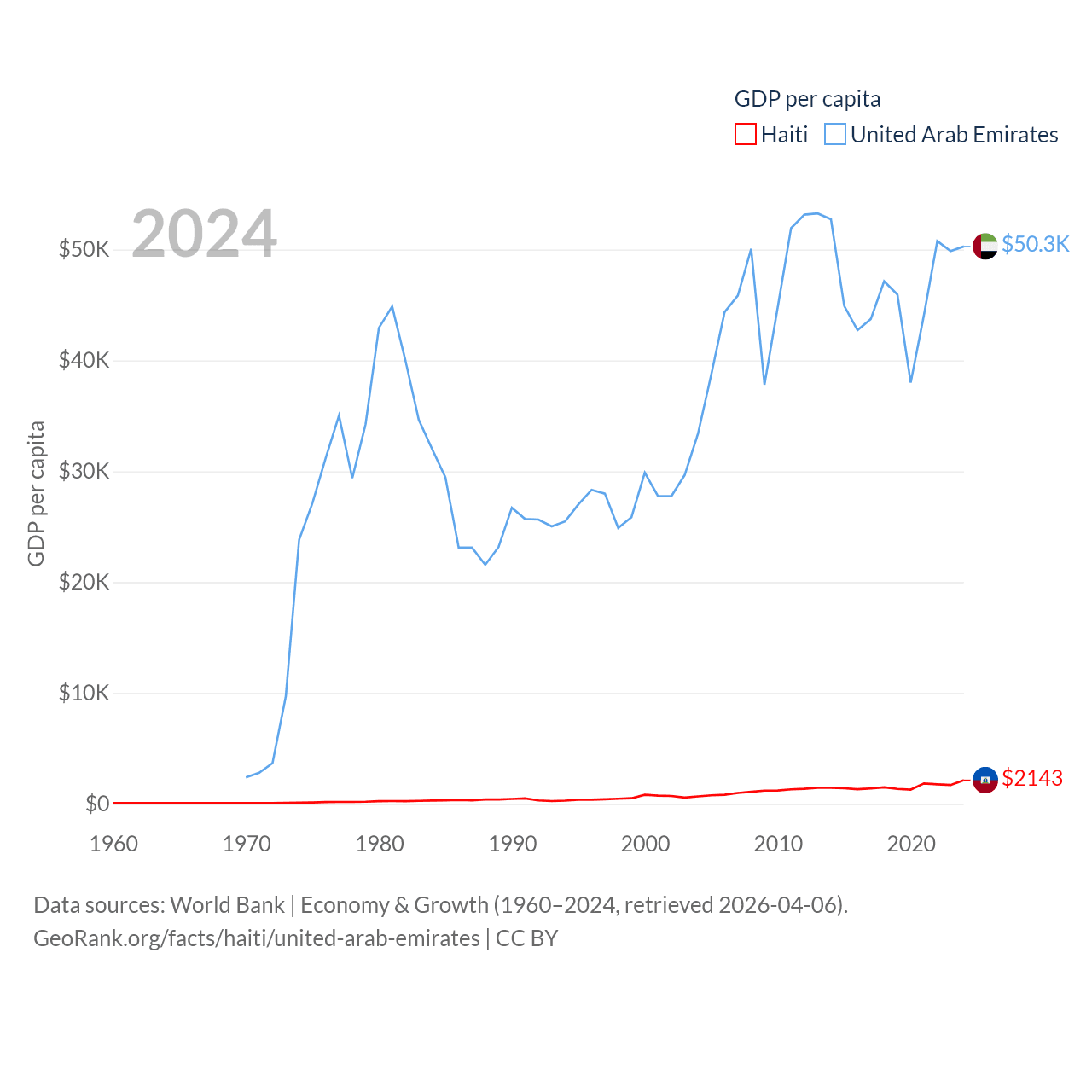 By GDP, Haiti ranks 117/197 ($25.2B) and The United Arab Emirates ranks 27/197 ($552B). By GDP per capita, Haiti ranks 153/197 ($2,143), while The United Arab Emirates ranks 24/197 ($50,274).