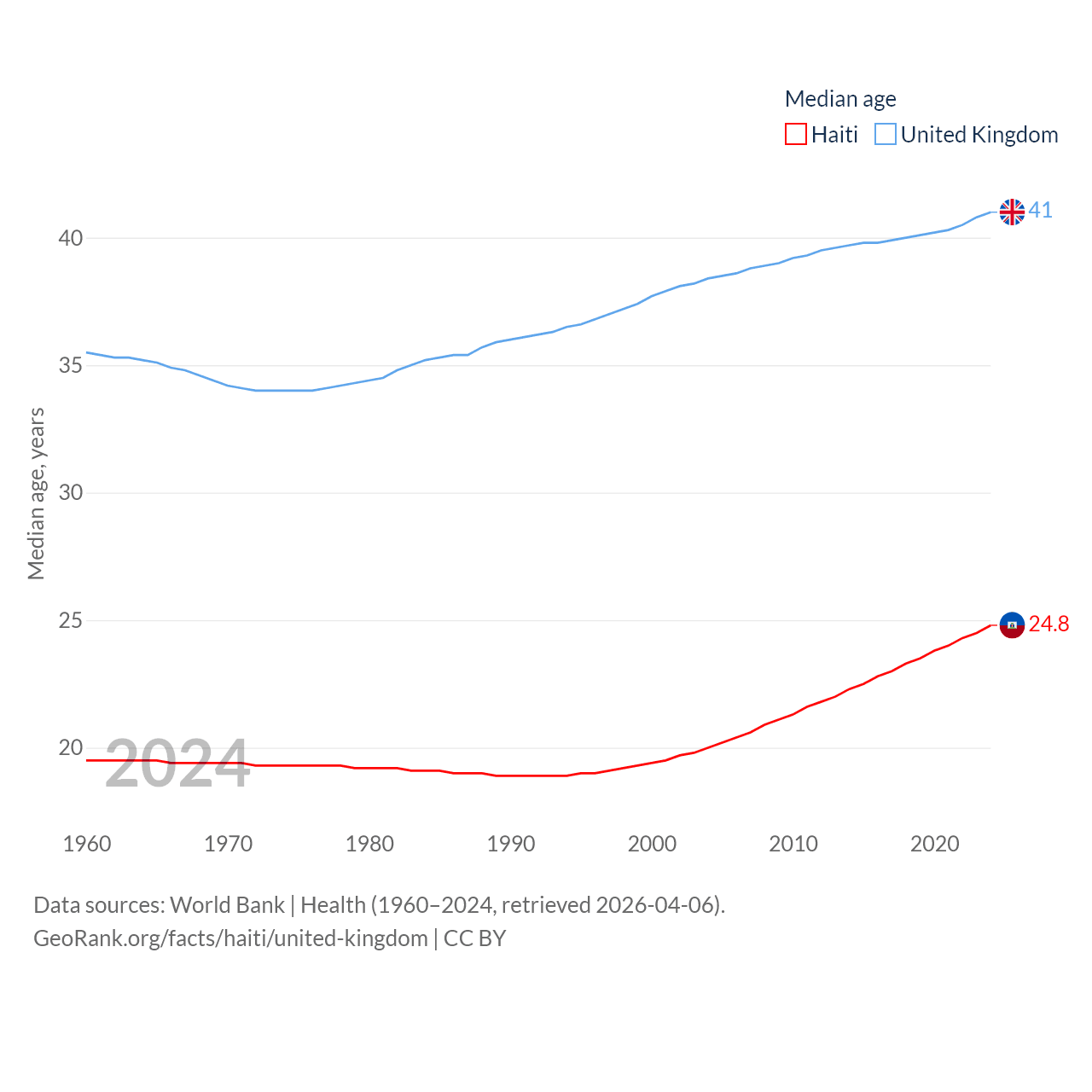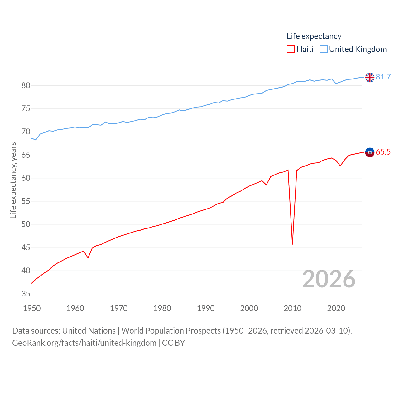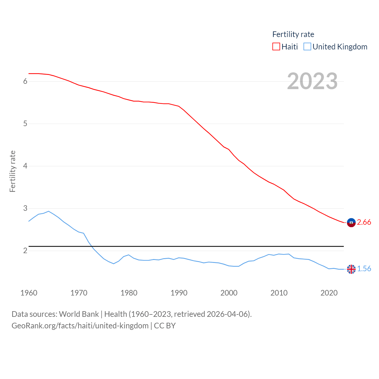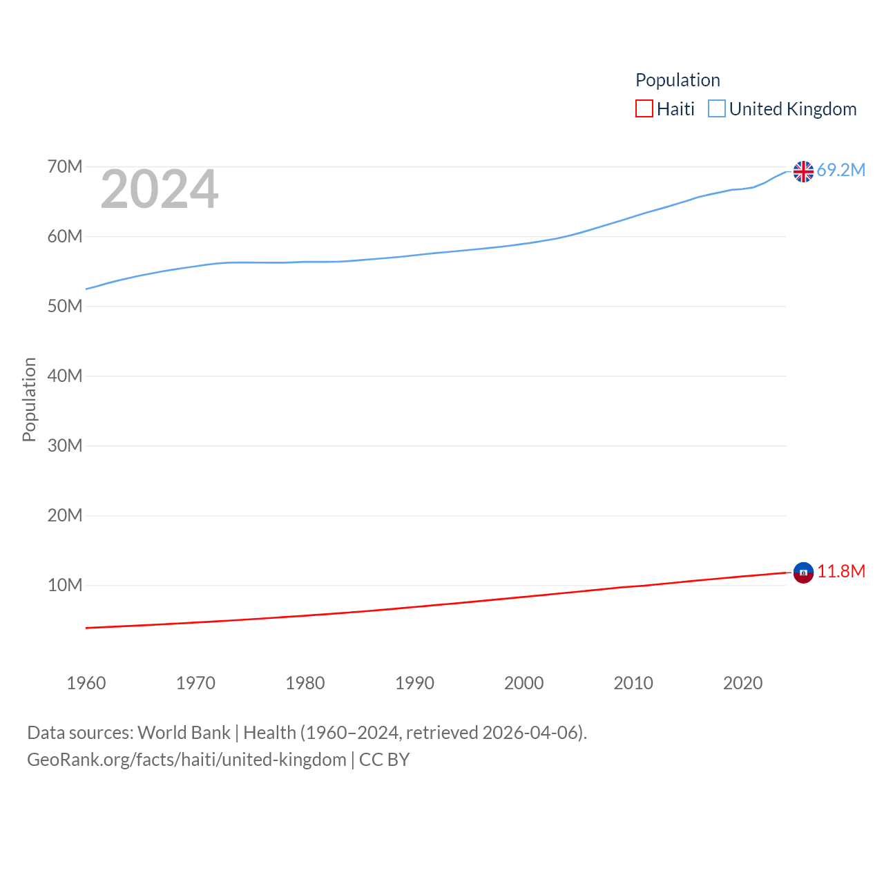 Haiti has a population of 11.8M (ranked 83/197), compared with 69.2M in The United Kingdom (ranked 21/197). Haiti's land area is 10,641 sq mi versus 93,410 sq mi for The United Kingdom (ranked 142nd vs. 78th).