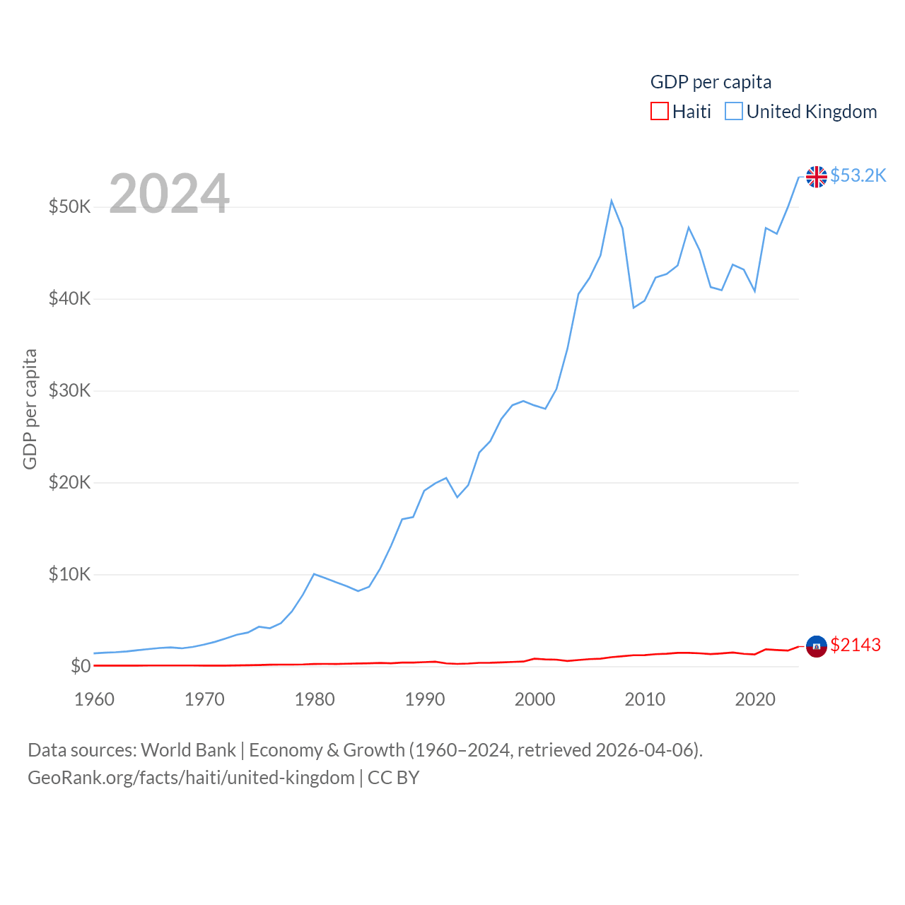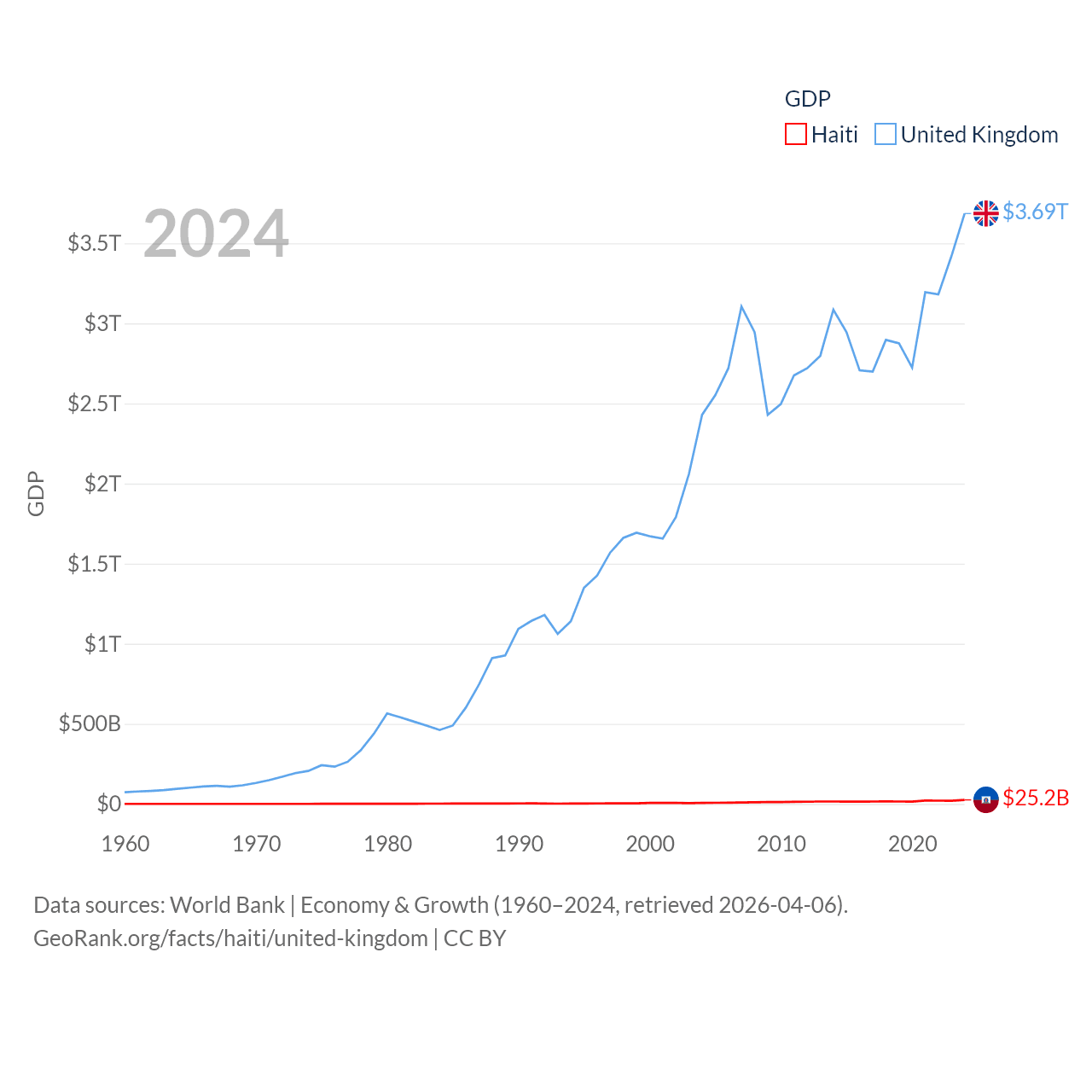 By GDP, Haiti ranks 117/197 ($25.2B) and The United Kingdom ranks 6/197 ($3.69T). By GDP per capita, Haiti ranks 153/197 ($2,143), while The United Kingdom ranks 22/197 ($53,246).