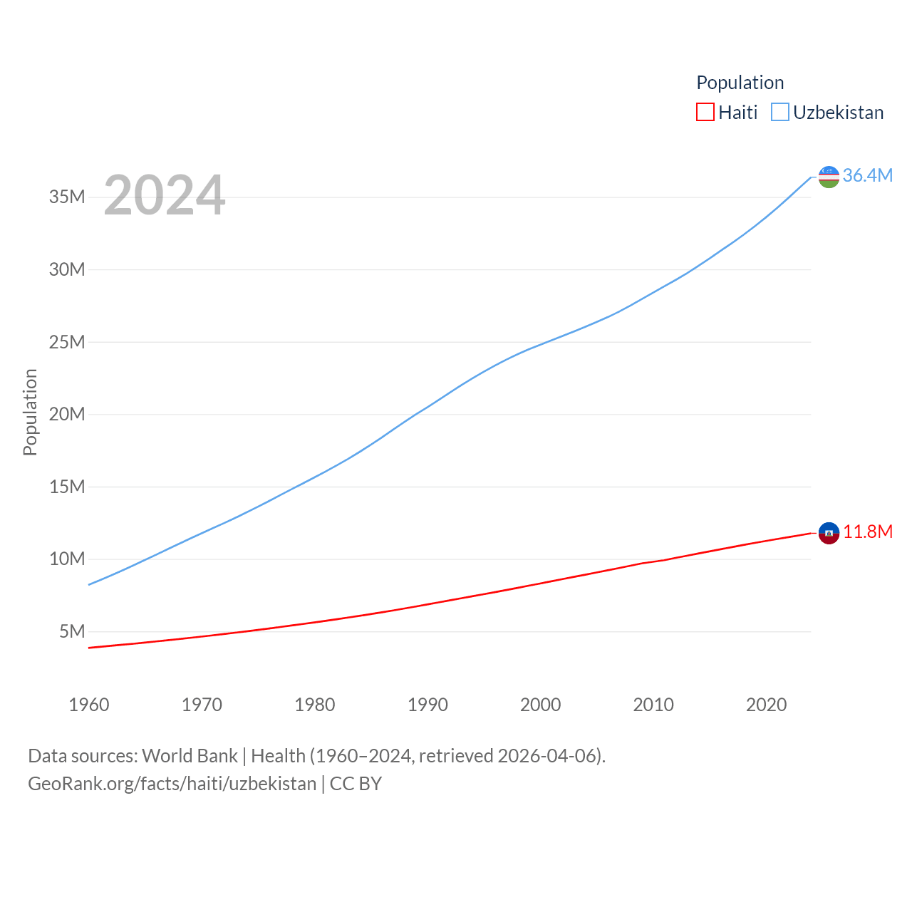 Haiti has a population of 11.8M (ranked 83/197), compared with 36.4M in Uzbekistan (ranked 43/197). Haiti's land area is 10,641 sq mi versus 170,136 sq mi for Uzbekistan (ranked 142nd vs. 56th).