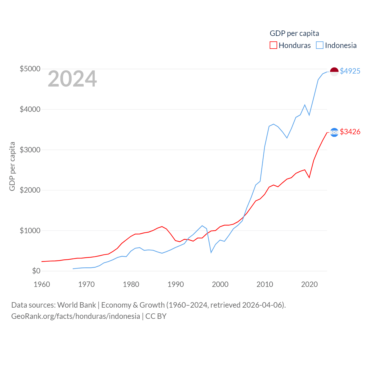 By GDP, Honduras ranks 104/197 ($37.1B) and Indonesia ranks 16/197 ($1.4T). By GDP per capita, Honduras ranks 136/197 ($3,426), while Indonesia ranks 121/197 ($4,925).