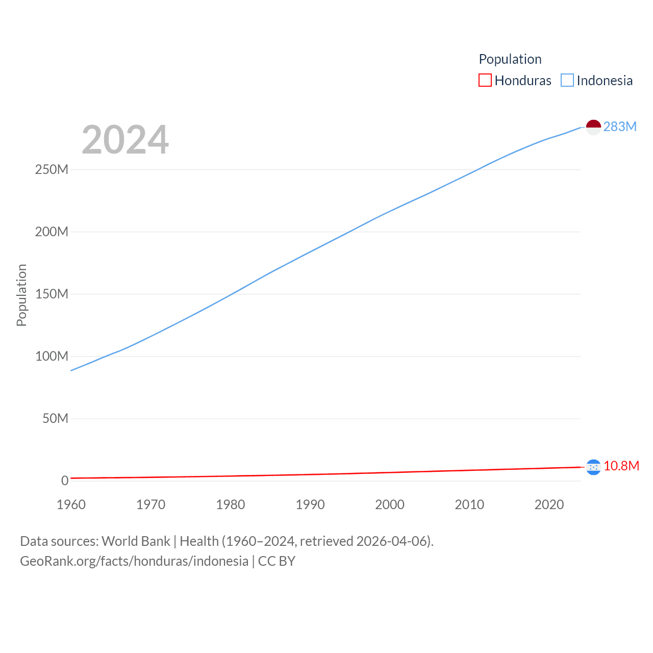 Honduras has a population of 10.8M (ranked 89/197), compared with 283M in Indonesia (ranked 4/197). Honduras' land area is 43,201 sq mi versus 730,720 sq mi for Indonesia (ranked 100th vs. 14th).