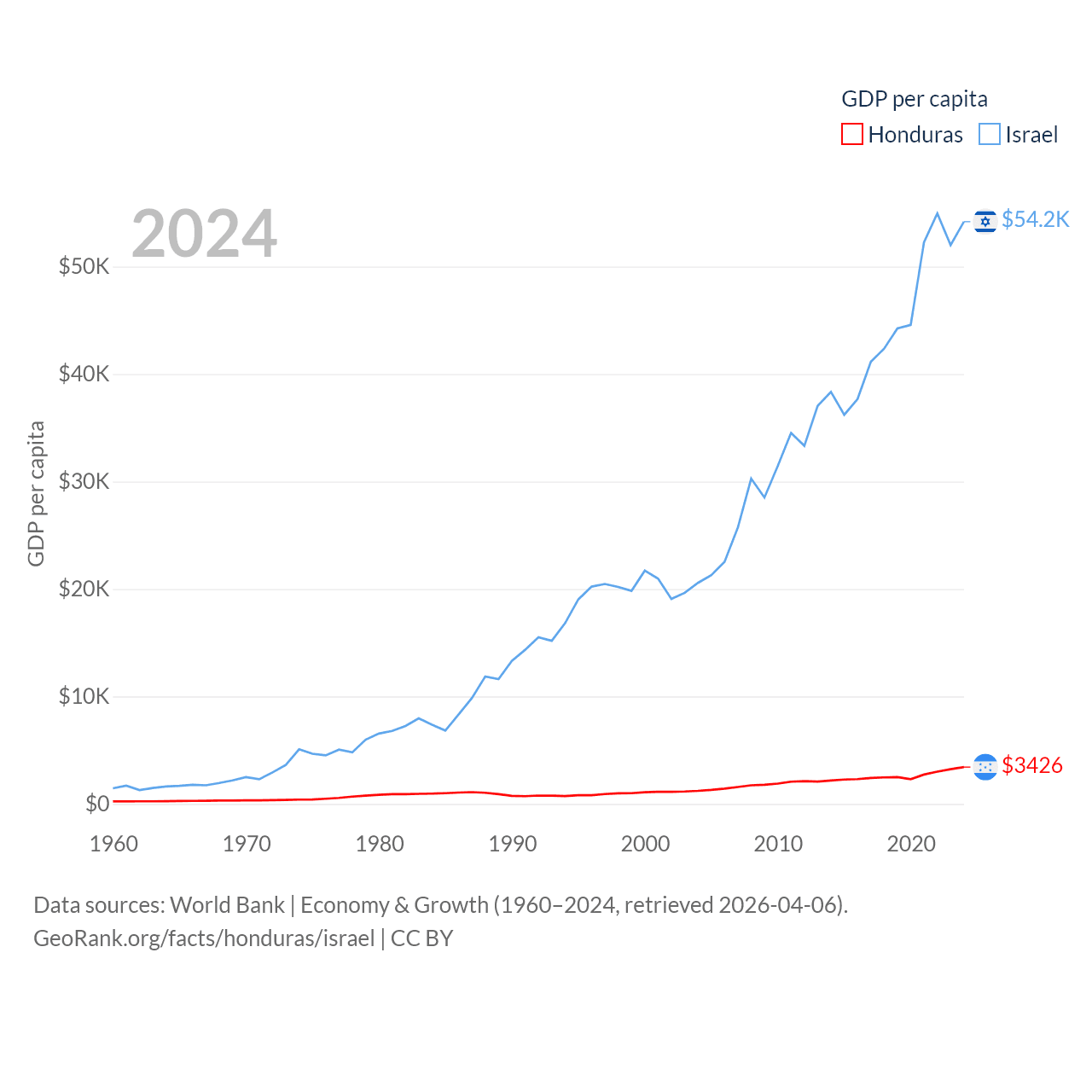 By GDP, Honduras ranks 104/197 ($37.1B) and Israel ranks 29/197 ($540B). By GDP per capita, Honduras ranks 136/197 ($3,426), while Israel ranks 21/197 ($54,177).