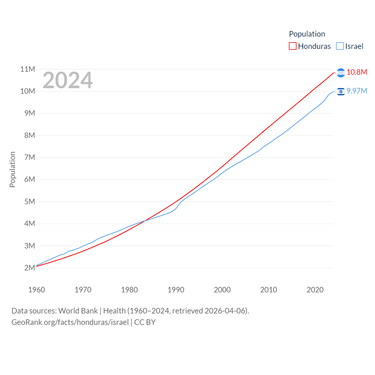 Honduras has a population of 10.8M (ranked 89/197), compared with 9.97M in Israel (ranked 96/197). Honduras' land area is 43,201 sq mi versus 8,355 sq mi for Israel (ranked 100th vs. 149th).