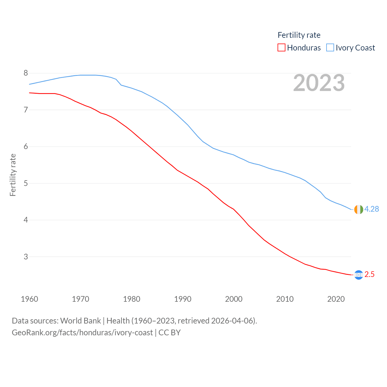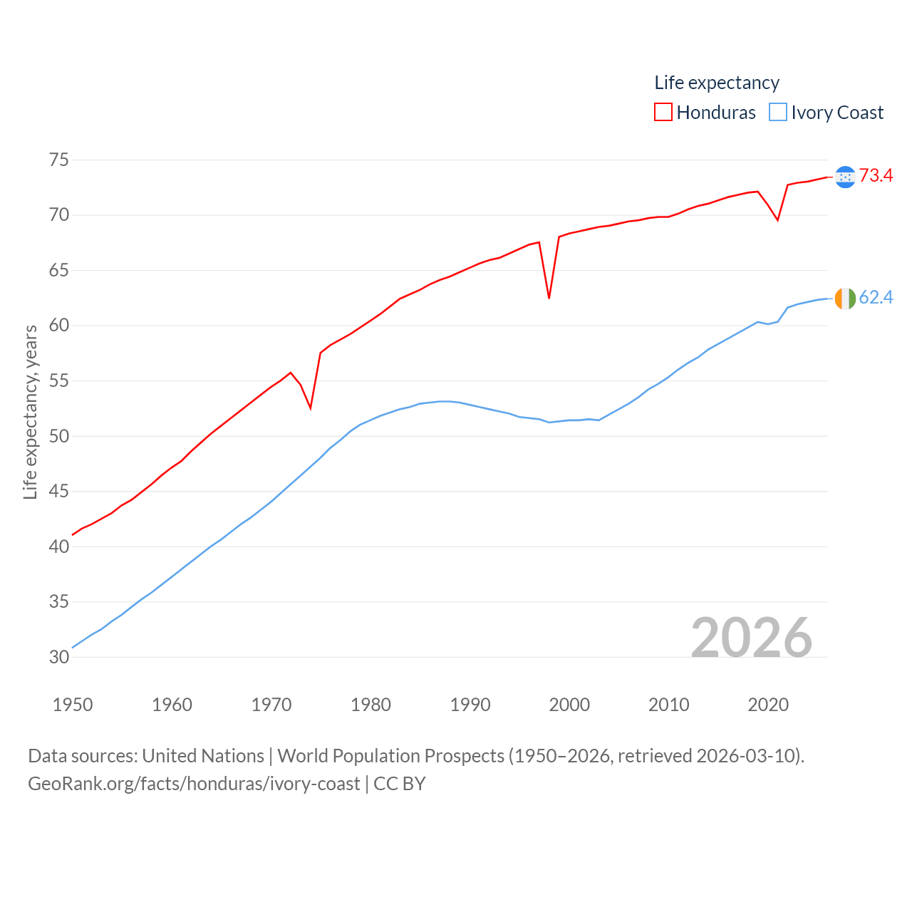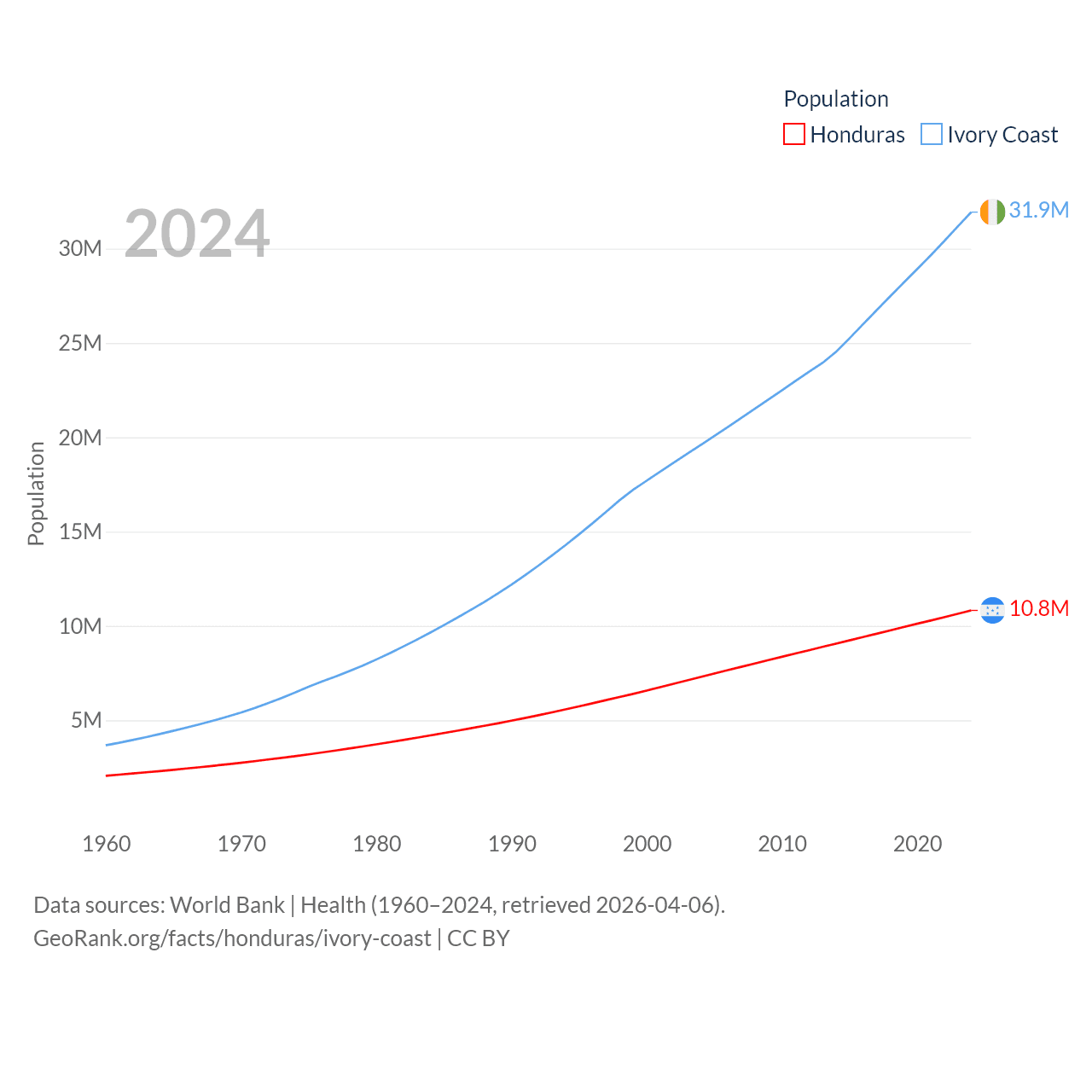 Honduras has a population of 10.8M (ranked 89/197), compared with 31.9M in Ivory Coast (ranked 50/197). Honduras' land area is 43,201 sq mi versus 122,780 sq mi for Ivory Coast (ranked 100th vs. 66th).