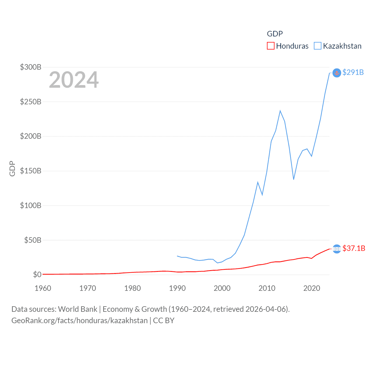 By GDP, Honduras ranks 104/197 ($37.1B) and Kazakhstan ranks 48/197 ($291B). By GDP per capita, Honduras ranks 136/197 ($3,426), while Kazakhstan ranks 71/197 ($14,155).