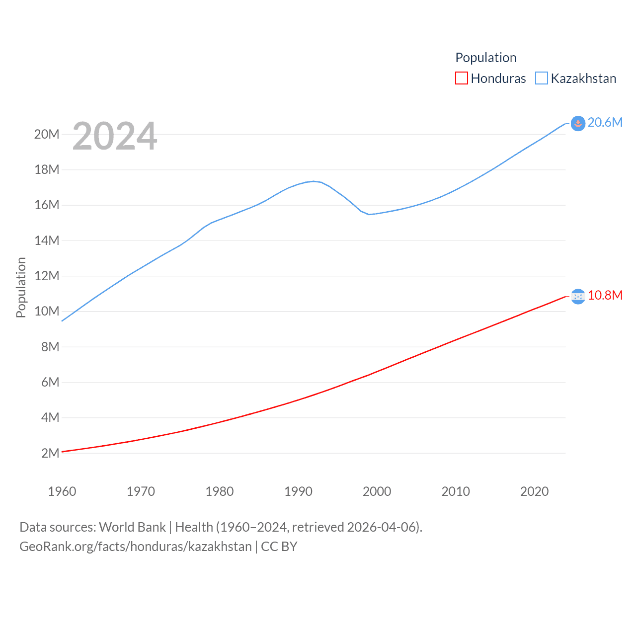 Honduras has a population of 10.8M (ranked 89/197), compared with 20.6M in Kazakhstan (ranked 64/197). Honduras' land area is 43,201 sq mi versus 1,042,360 sq mi for Kazakhstan (ranked 100th vs. 9th).