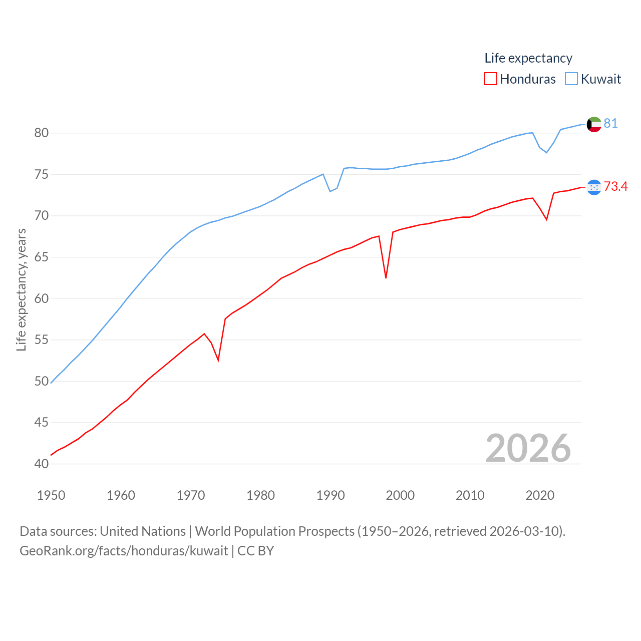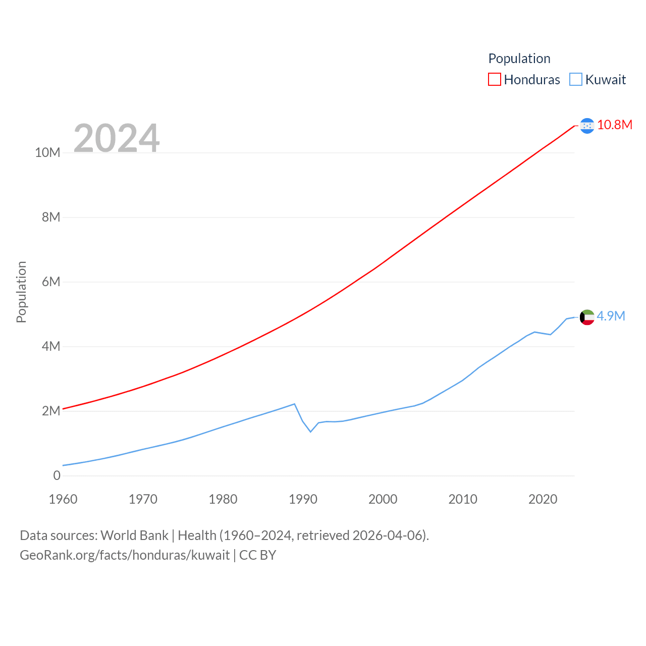 Honduras has a population of 10.8M (ranked 89/197), compared with 4.9M in Kuwait (ranked 127/197). Honduras' land area is 43,201 sq mi versus 6,880 sq mi for Kuwait (ranked 100th vs. 153rd).
