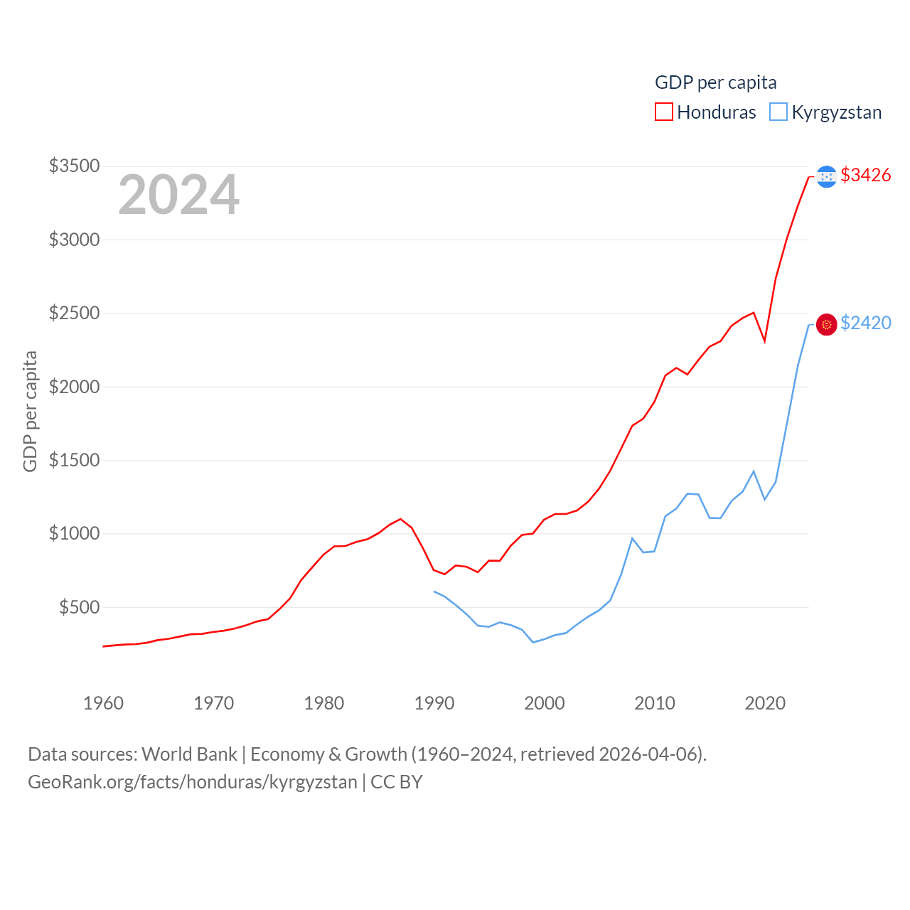 By GDP, Honduras ranks 104/197 ($37.1B) and Kyrgyzstan ranks 135/197 ($17.5B). By GDP per capita, Honduras ranks 136/197 ($3,426), while Kyrgyzstan ranks 150/197 ($2,420).