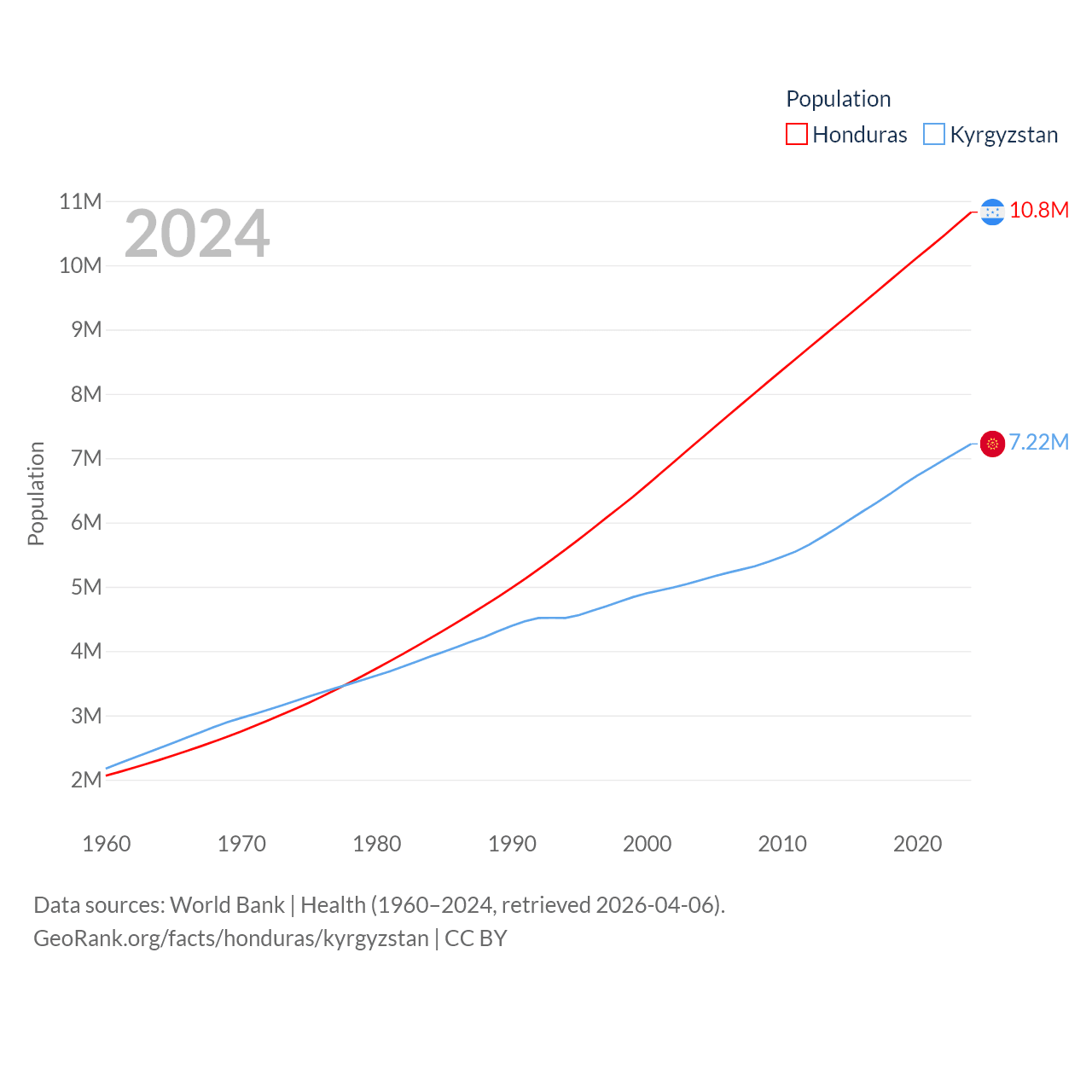 Honduras has a population of 10.8M (ranked 89/197), compared with 7.22M in Kyrgyzstan (ranked 106/197). Honduras' land area is 43,201 sq mi versus 74,054 sq mi for Kyrgyzstan (ranked 100th vs. 86th).